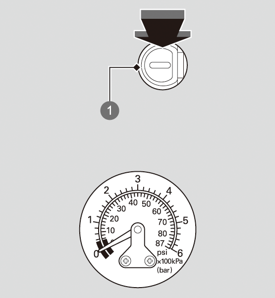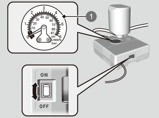 タイヤの空気圧を空気圧計で確認するときは、コンプレッサーの電源をOFFにしてください。