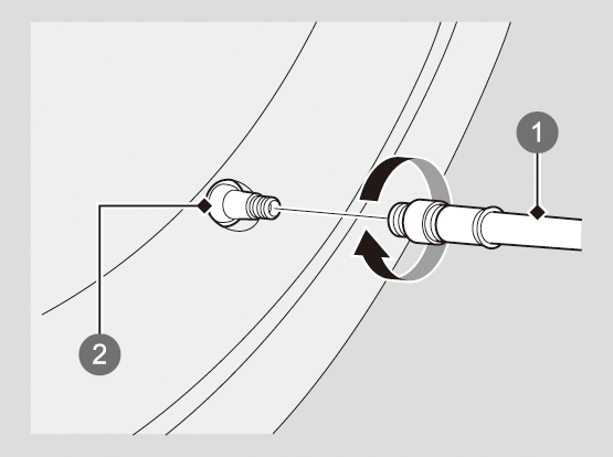 - タイヤのバルブにコンプレッサーホースをきつく締め付ける。