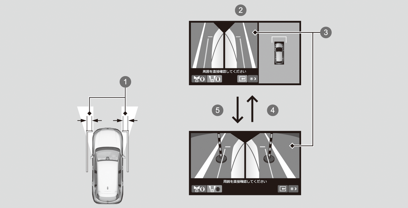 - グラウンドビュー:4台のカメラでとらえた合成画像で、車両を真上から見たイメージで表現されます。