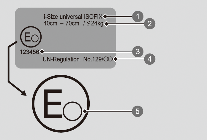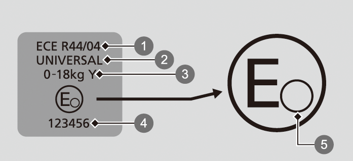 UN基準の認可を受けたシートベルト固定タイプチャイルドシートまたはISOFIX/i-Sizeチャイルドシートには、認可マークが表示されています。チャイルドシートについている認可マークを確認してください。