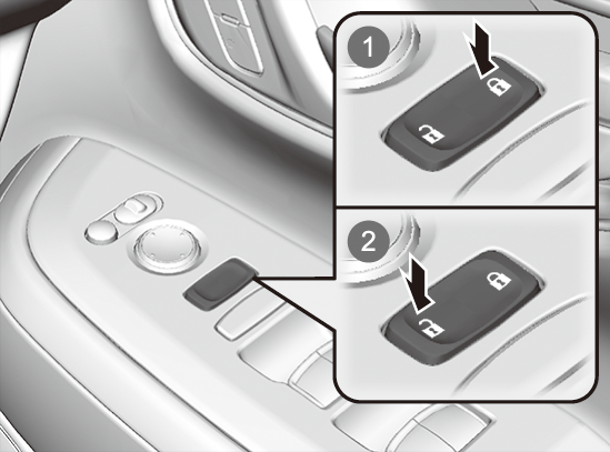 運転席または助手席ドアのマスタードアロックスイッチで施錠/解錠すると、ほかのすべてのドア、テールゲート、フューエルリッドも同時に施錠/解錠されます。