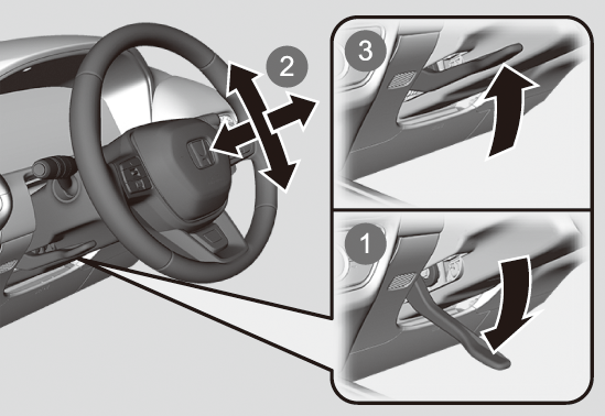 - ハンドル位置調節レバーは、コラムカバーの下にあります。