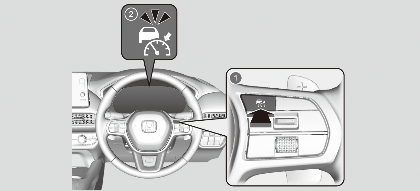 先行車を検知している場合のみ作動させる事ができ、現在の車速にかかわらず設定車速が約30km/hに設定されます。車両が動いていない場合は、ブレーキペダルを踏んでいても作動することができます。