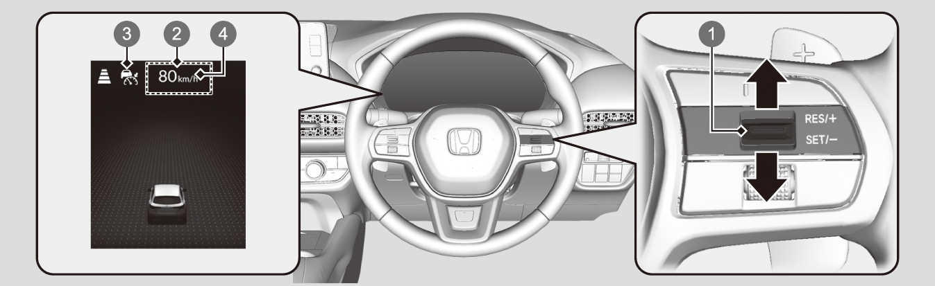 ブレーキペダルを操作していないときにRES/+/SET/-スイッチを上か下に押すと現在の車速が設定車速とされ、渋滞追従機能付ACCが作動し、メーターにアイコンや設定車速が表示されます。