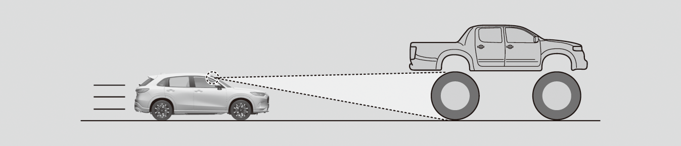 悪天候などで、フロントワイドビューカメラが先行車との車間距離を測定できないときは、システムが作動しないことがあります。