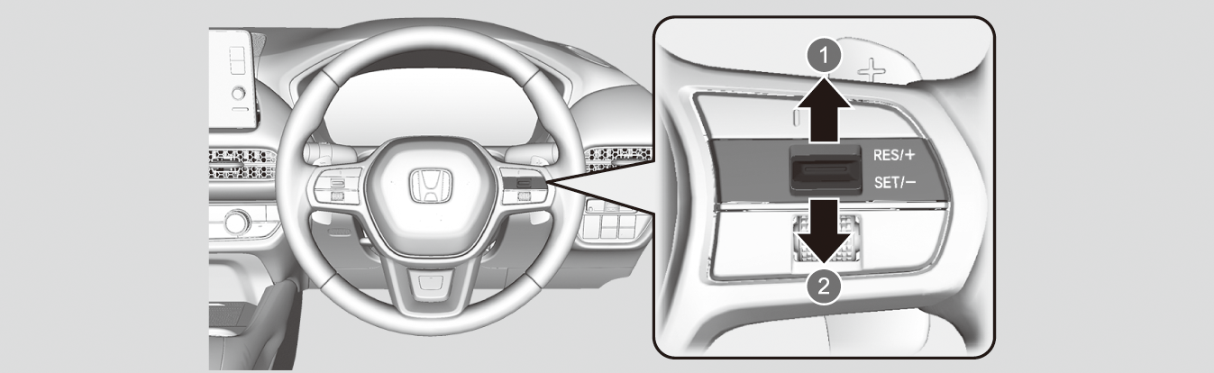 解除前の設定車速を復帰させるには:渋滞追従機能付ACCを解除したあと、先行車を検知している場合、停車状態でもRES/+/SET/-スイッチを上に押すとメーター上に表示されている解除前の設定車速(グレー)で作動を開始することができます。