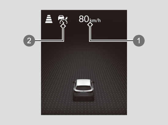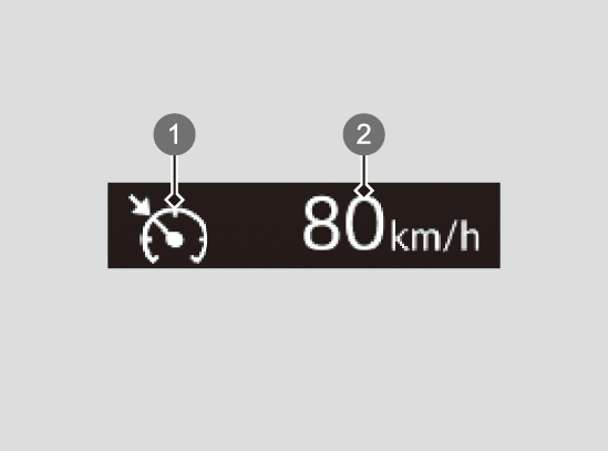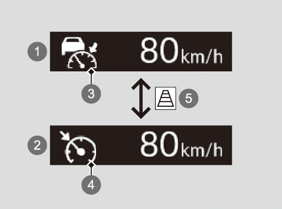 CANCELスイッチまたはブレーキペダルで解除した場合、その直前の設定車速がグレーで表示されます。RES/+/SET/-スイッチを上に押した場合、この車速で作動が開始されます。