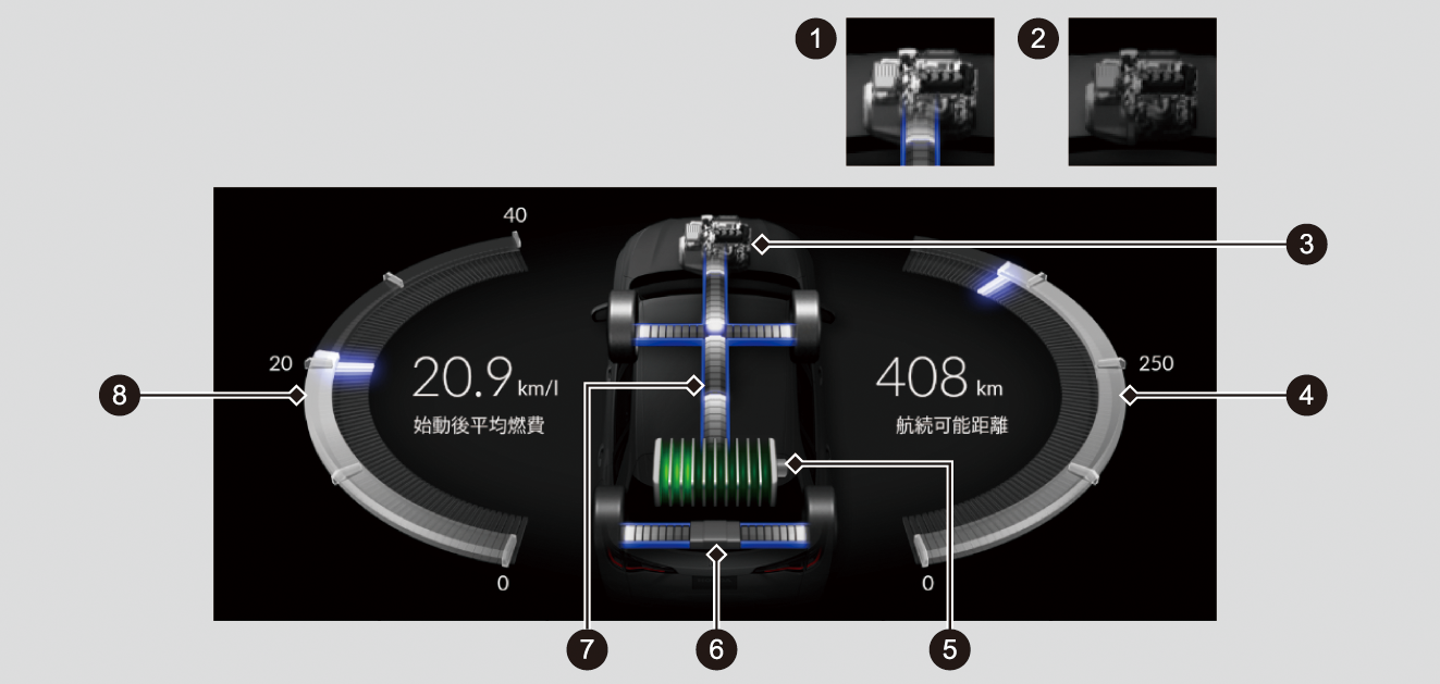 バッテリーへの充電、平均燃費、航続可能距離、および車両へのアシスト状態を確認できます。