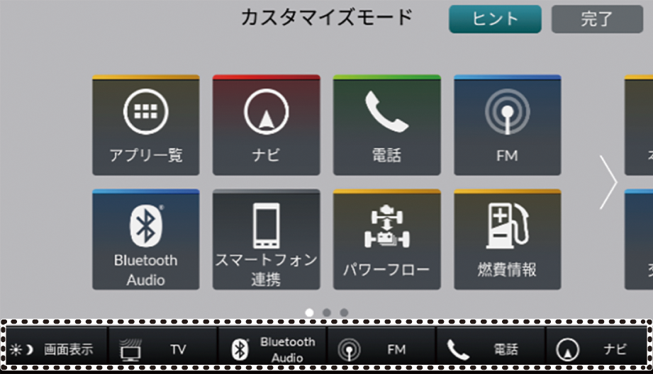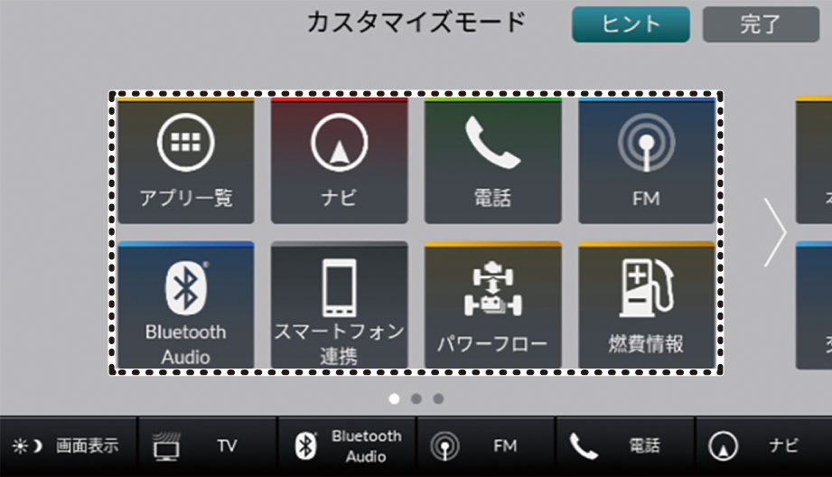 を選択する、または、カスタマイズモード画面を左右にスライドさせると、次の画面に切り替わります。