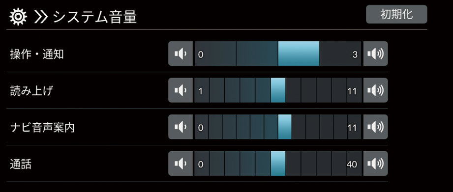 - ナビ音声案内:ナビ音声案内の音量を調整します。0~11の間で調整します。(初期値:6)