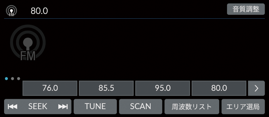 - エリア選局:移動にともない地域が変わったときに、自動でその地域で受信できる放送局をプリセットスイッチに表示します。もう一度エリア選局を選択すると表示が解除されます。