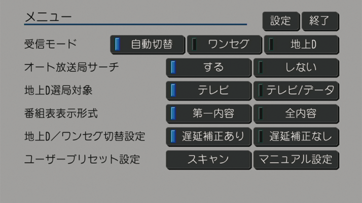 - 地上D/ワンセグ切替設定:地上Dとワンセグ切り替え時の設定をします。(初期値:遅延補正あり)
