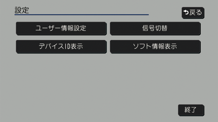 設定:ユーザー情報設定、デバイスID表示、信号切替、ソフト情報表示を設定/表示します。
