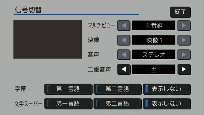 - 二重音声:マルチチャンネル音声放送受信時に、音声を切り替えます。