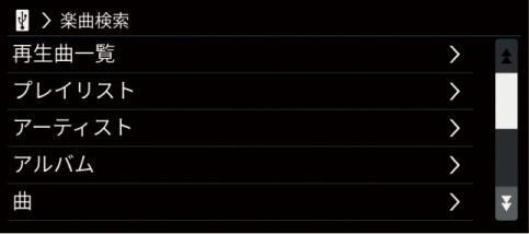 操作画面の楽曲検索を選択すると、再生中のメディアのカテゴリやフォルダなどからリストを絞り込んで曲を探すことができます。
