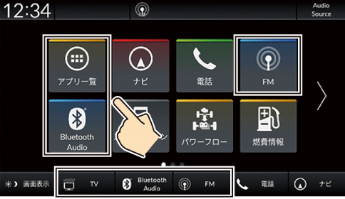 画面上部のAudio Sourceを選択すると、どの画面からでもソースを変更できます。ソースアイコンを選択すると、どの画面からでも再生中のソースの操作画面を表示します。