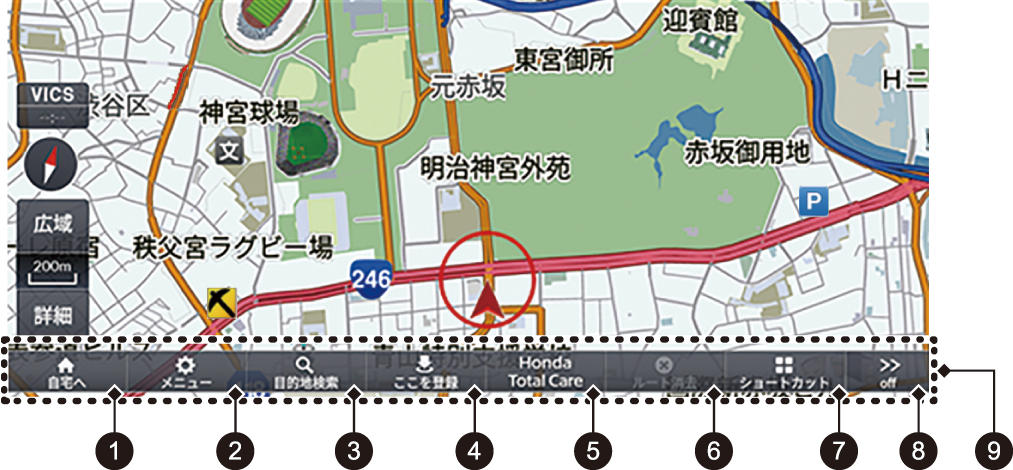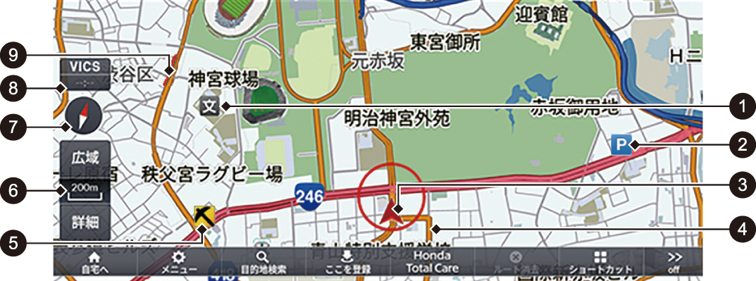 詳細、広域を選択すると地図のスケールを変更することができます。