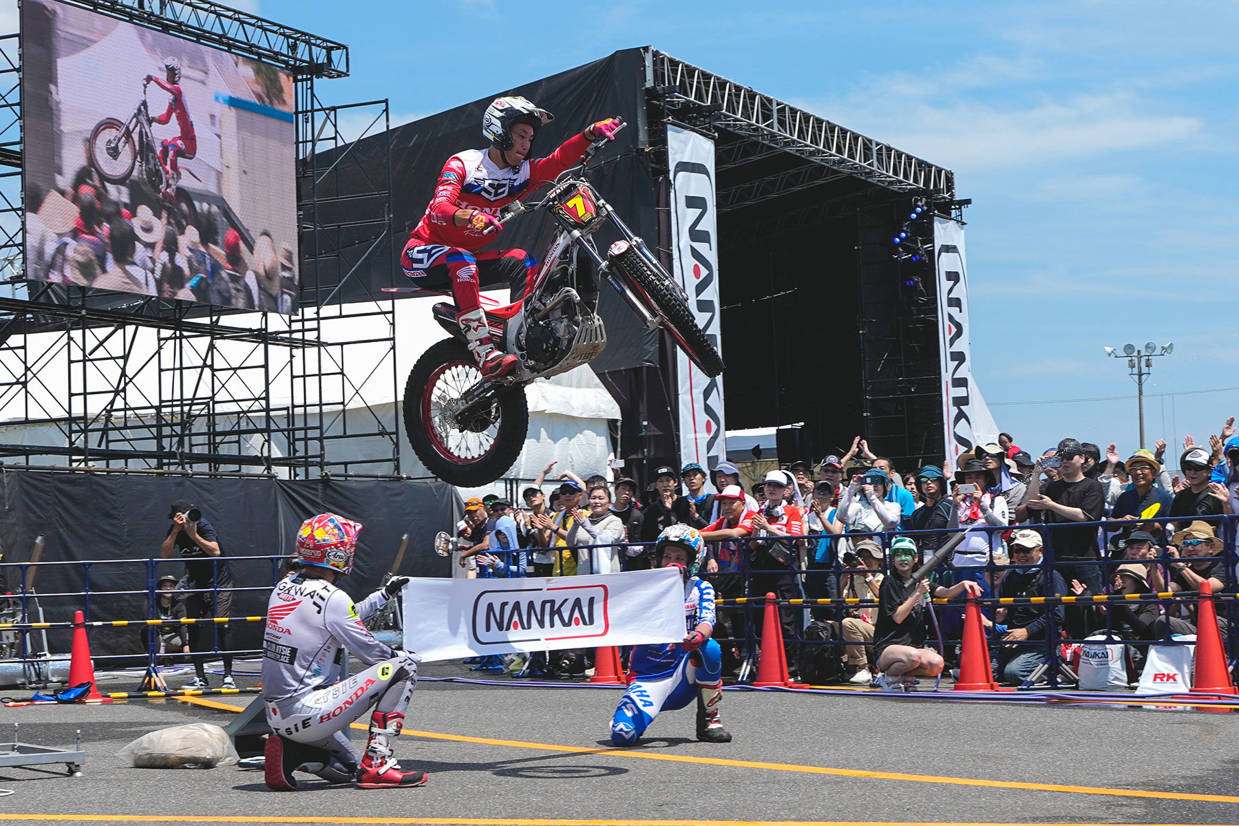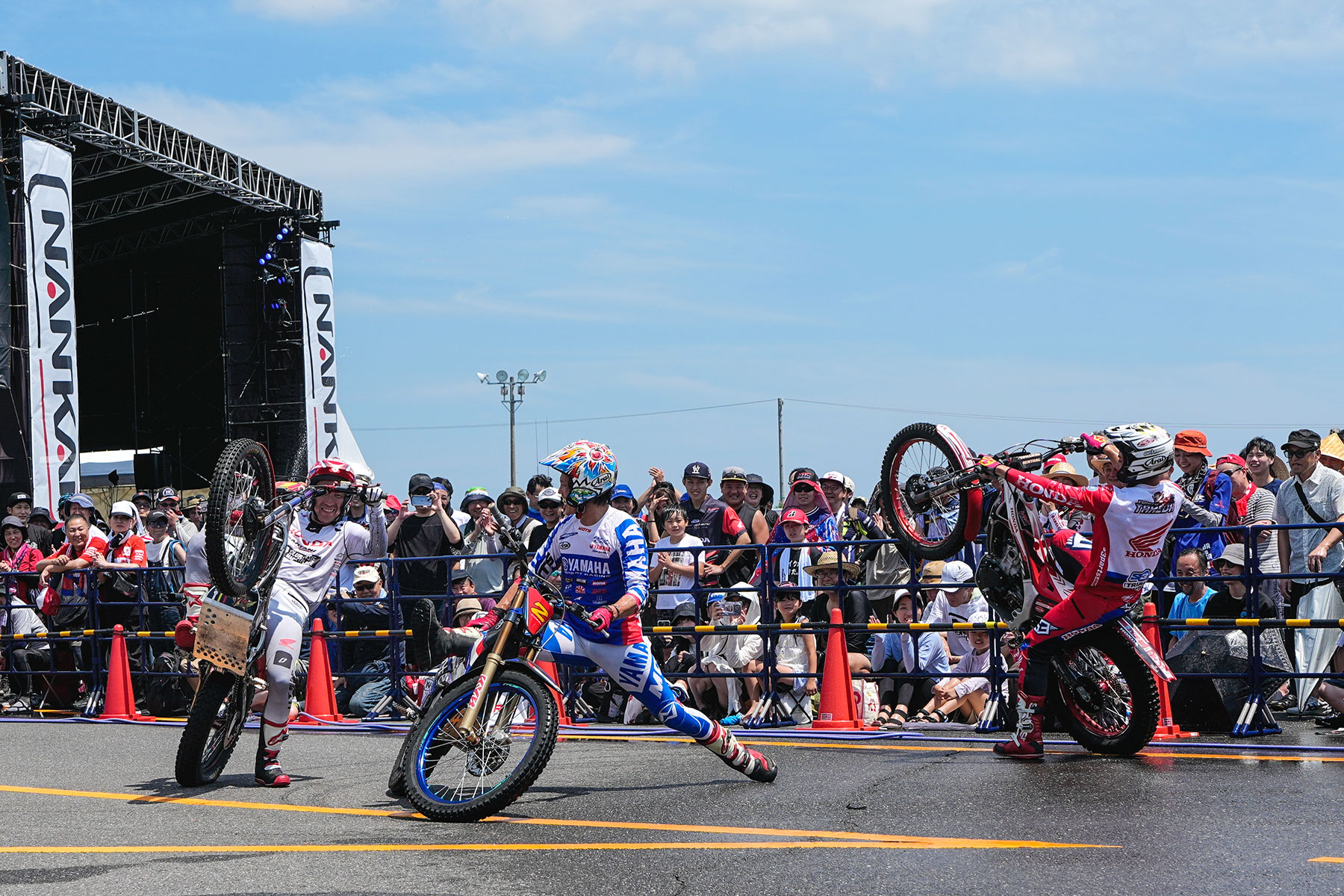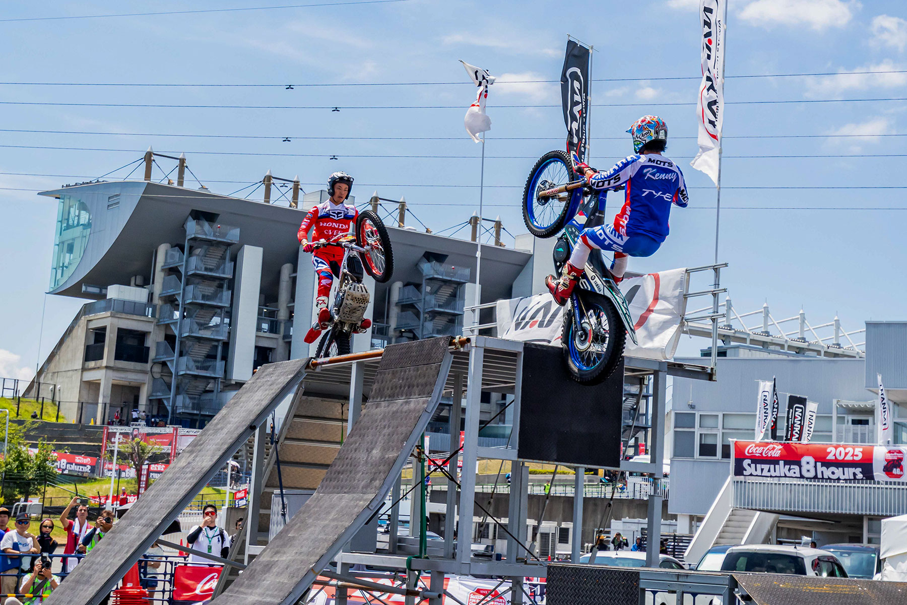 今回の鈴鹿8耐で人気だったのが、イベント会場で行なわれるトライアルデモンストレーション「NANKAI トライアルパフォーマンス」。ここでは、Team MITANI Hondaの小川友幸選手が出演しました。盟友であり全日本トライアル選手権シリーズでは最大のライバルである黒山健一選手(YAMAHA)に加え、Team MITANI Hondaのチームメイトである武田呼人選手とともにデモンストレーション会場に集まった多くの観客から喝さいを浴びていました。