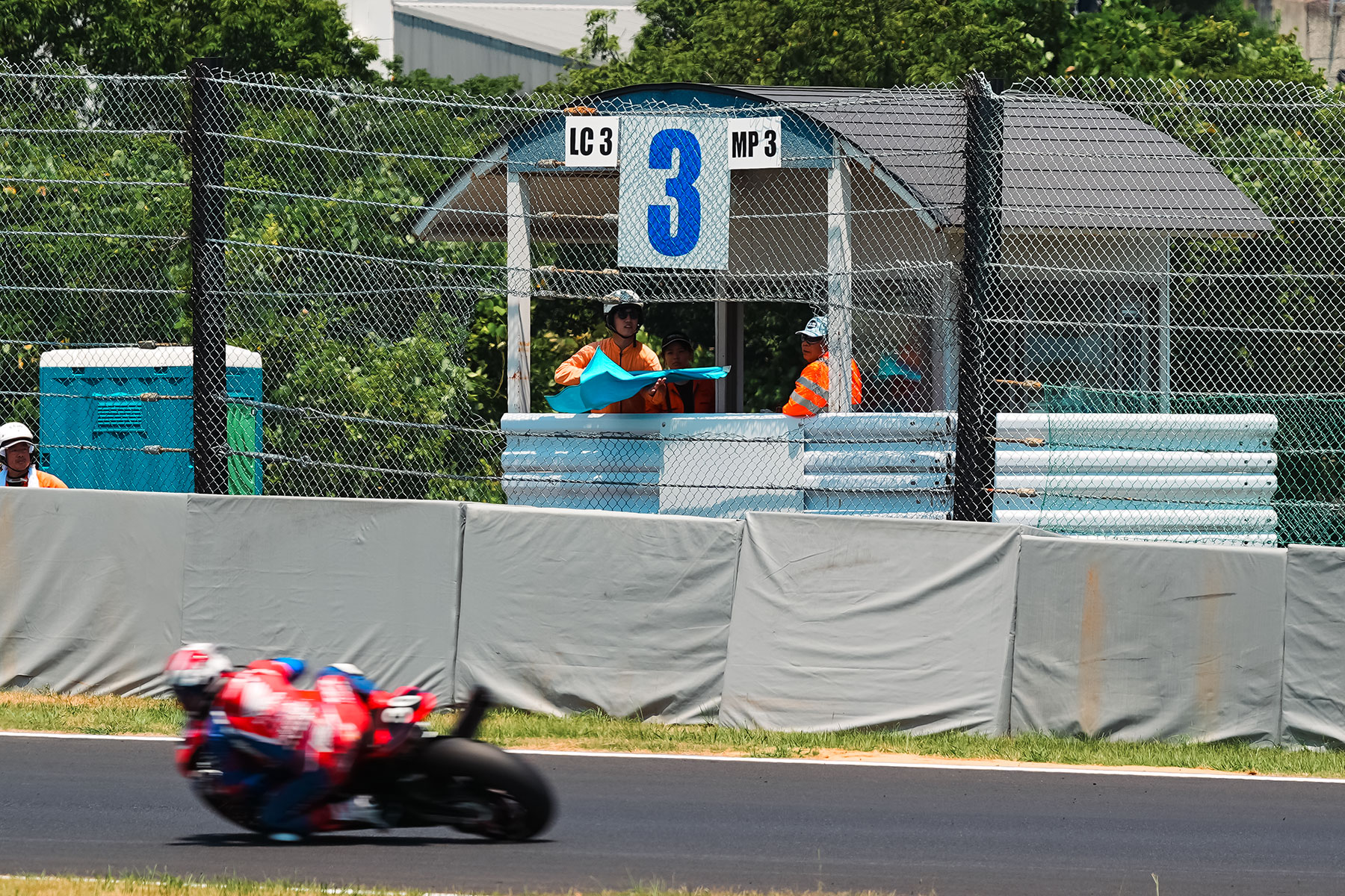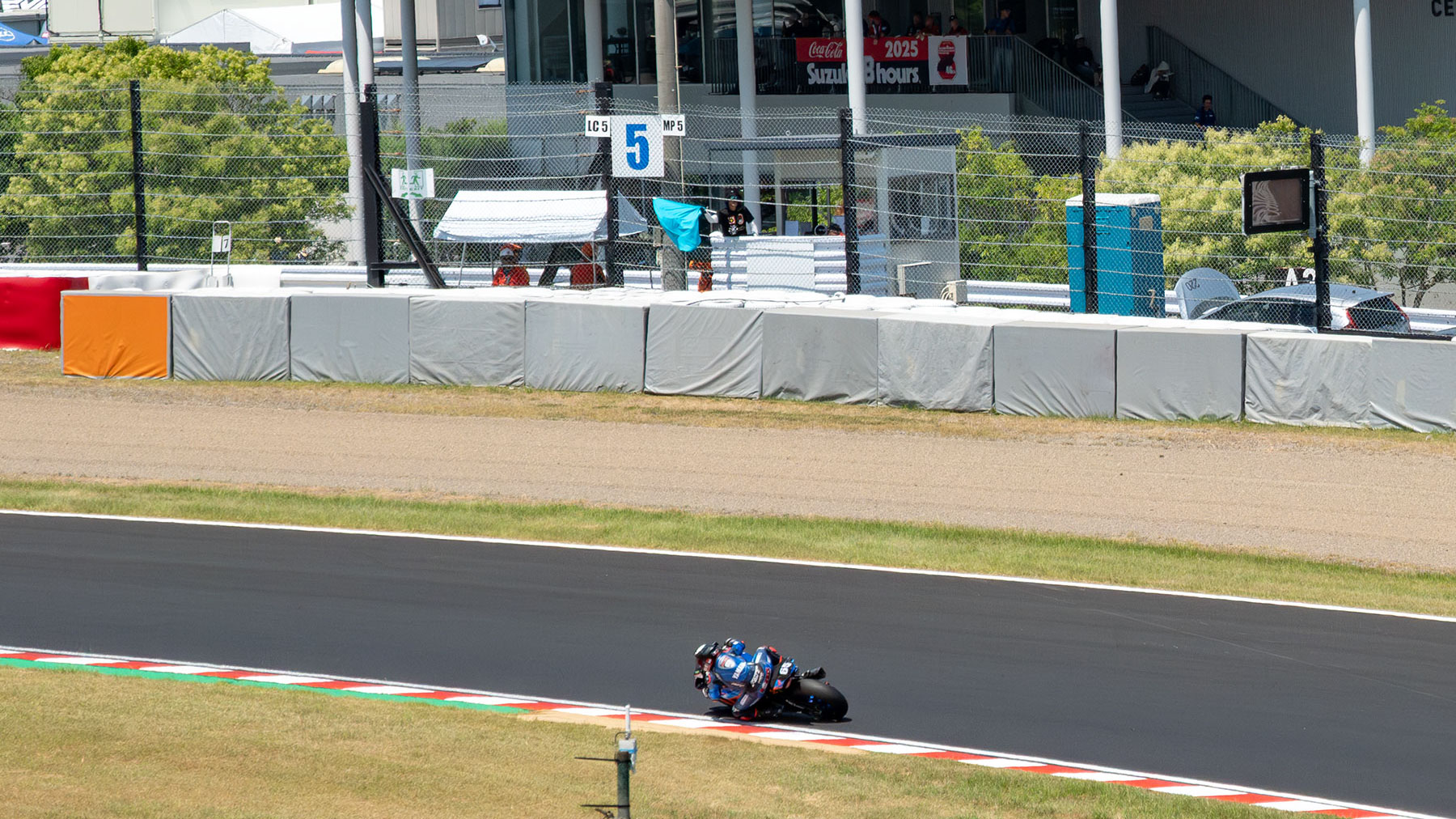 鈴鹿8耐では、常に速いライダーが周回遅れのライダーを追い抜くシーンが多く見られます。その際、後方から速いライダーが接近していることを知らせ、安全に追い越しができるよう急な進路変更を控えることを意味するブルーフラッグを掲示するのですが、ブルーフラッグはほぼレース中に振り続けることになります。また、前方に危険があることを意味するイエローフラッグも、レース中に数えきれないほど掲示しています。