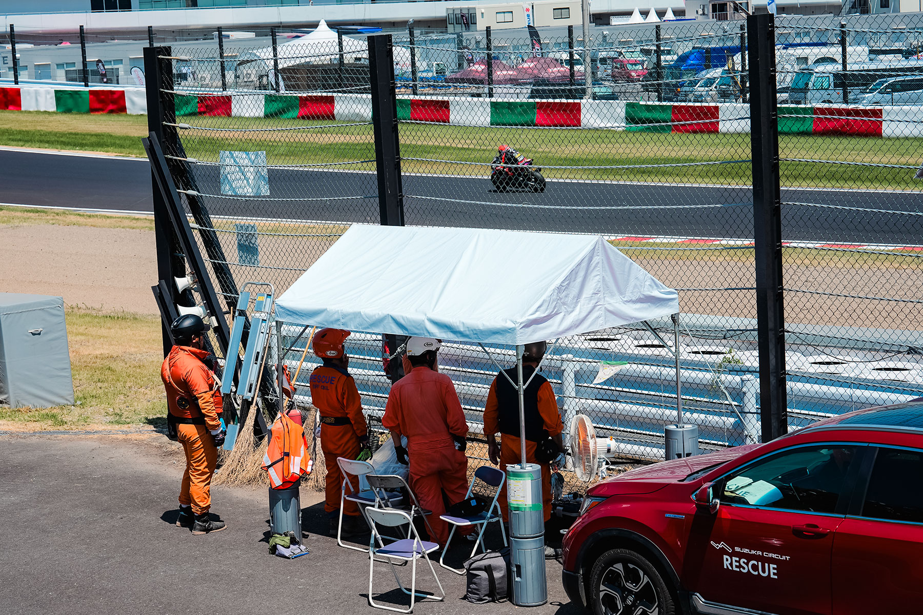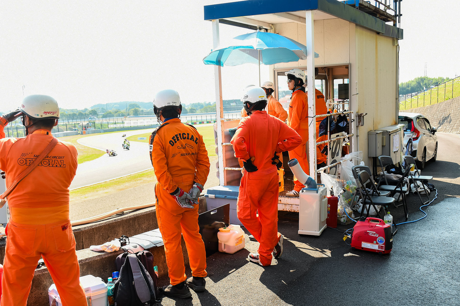 鈴鹿8耐でコースオフィシャルは、決勝レース開始時刻(11時30分)の4時間前、午前7時30分にはコースサイドで待機をはじめ、レースが終了する19時30分過ぎまで、実に12時間以上もコースサイドに常駐し、まさに一日中炎天下でライダーたちの安全を確保しています。