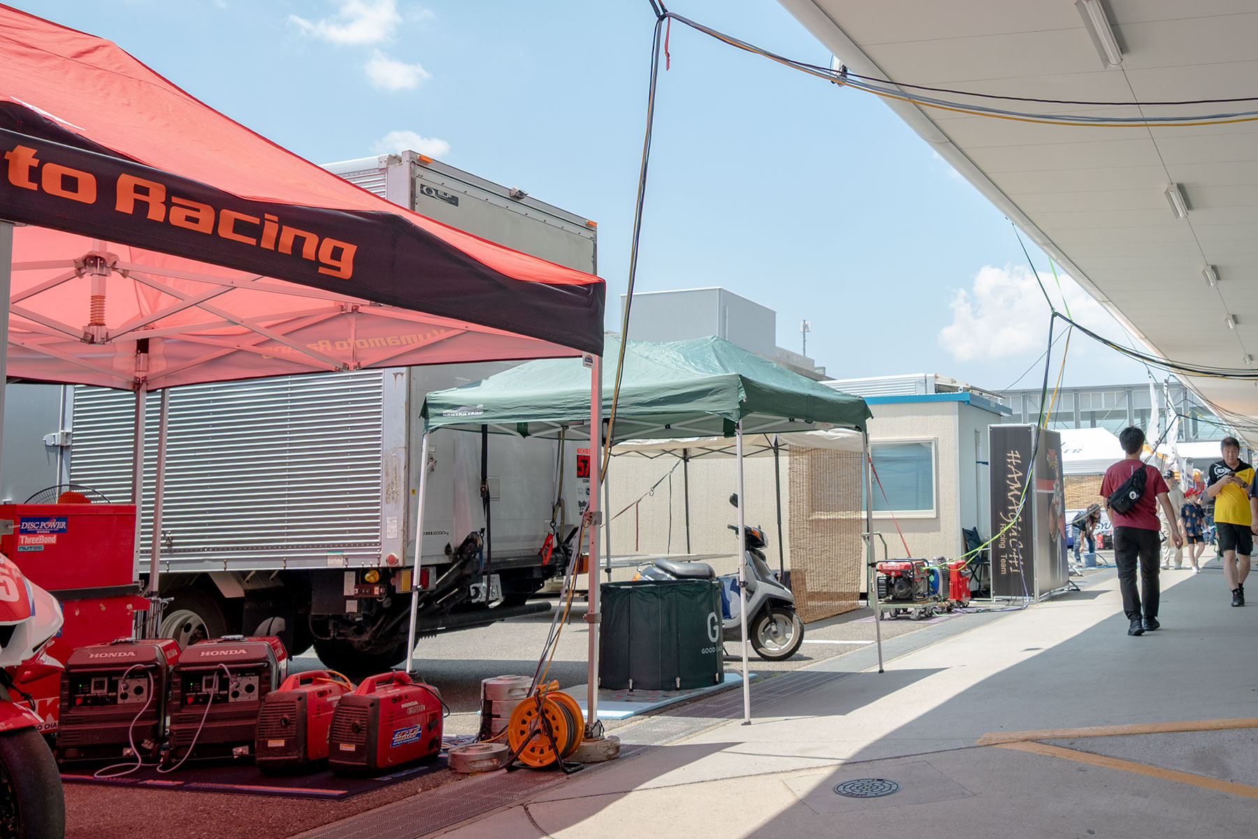 ほかの機材とは、マシンの走行状態を確認・管理するパソコンや、マシン細部の整備用に使用する手元用のライト、ピットとピットレーンの連絡用に使う無線機の充電や、もちろんスタッフが連絡用に常備する携帯電話の充電、ピット裏に陣取るスタッフたちがレース状況を見守るモニターなど多種多様。もちろん、猛暑の中を走るライダーがピットインしてくるごとに、わずかな時間でも冷風を送るために用意されているサーキュレーターにも電源は必要です。ライダーやスタッフの休憩所であるピット裏テントにある、ライダーケア用のドリンクを用意する冷蔵庫、食事用の炊飯器はホットプレートにも、発電機は欠かせない装備です。