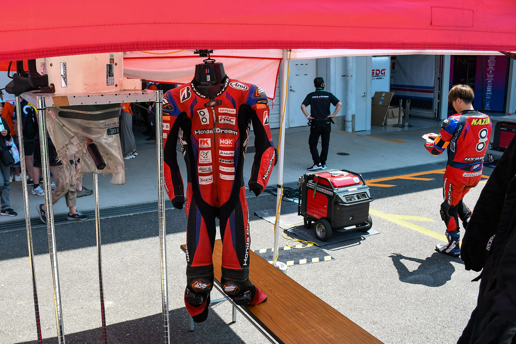 ピット裏のテントに、レーシングスーツを乾燥させるための乾燥機が設置されている光景は鈴鹿8耐ならでは。