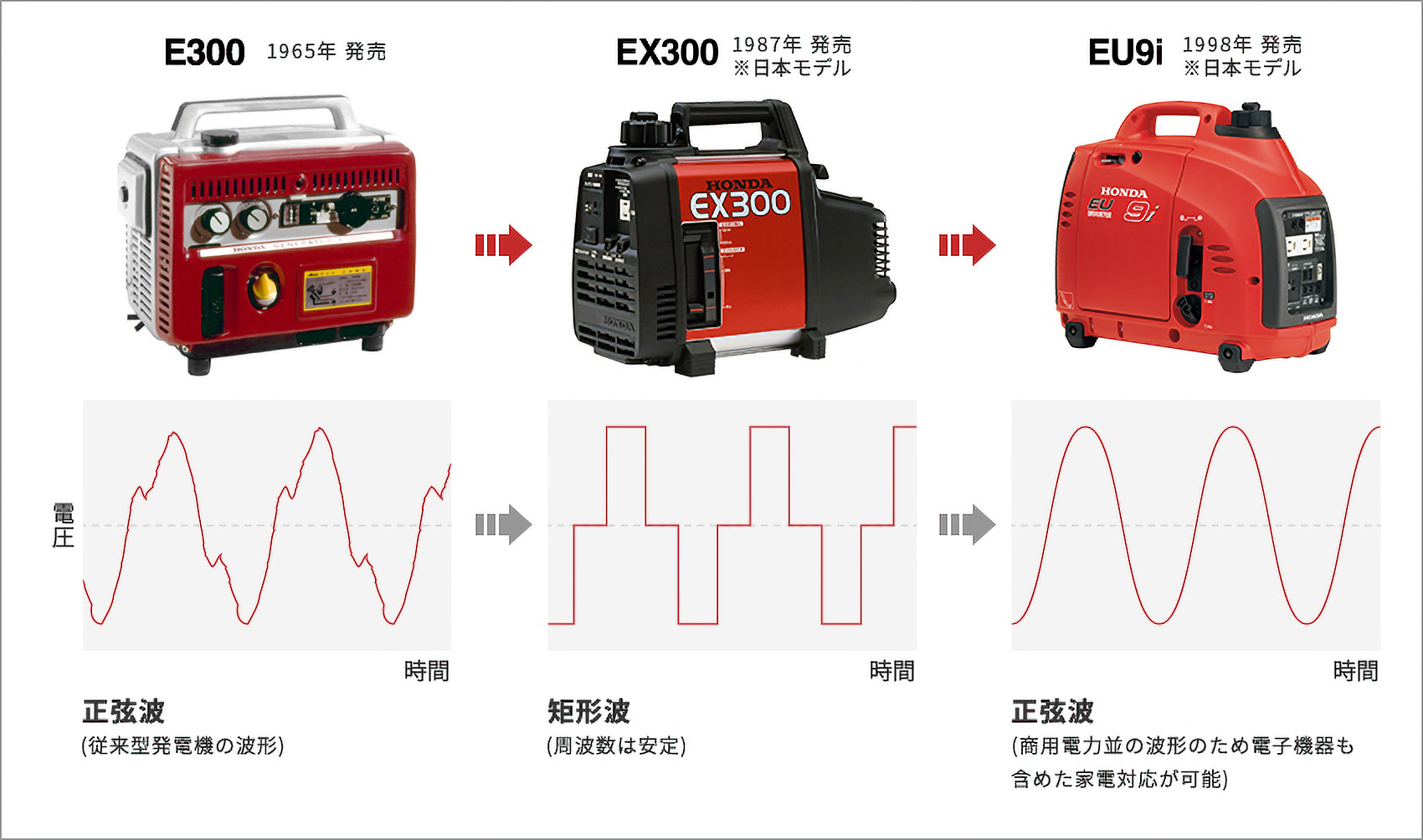 インバーター回路によって安定した周波数の発電が可能となり、高効率で使いやすい発電機へと前進しました。一方で、電気の波形の関係で一部対応できない機器があるという課題も残っていました。1996年に発売したEX500では、この課題をカスタムIC(集積回路)を搭載するなどによる正弦波インバーター発電システムによって解決。