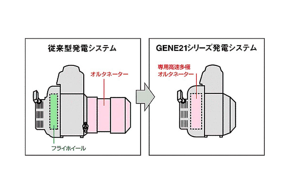 さらにGENE21シリーズでは、電気の質を高めるだけでなく、発電機の構造そのものも見直されました。下のイラストに示すように、従来はエンジンに外付けされていた汎用型のオルタネーターを廃し、高速多極オルタネーターを新たに搭載。これにより、大幅な小型・軽量化を実現しました。