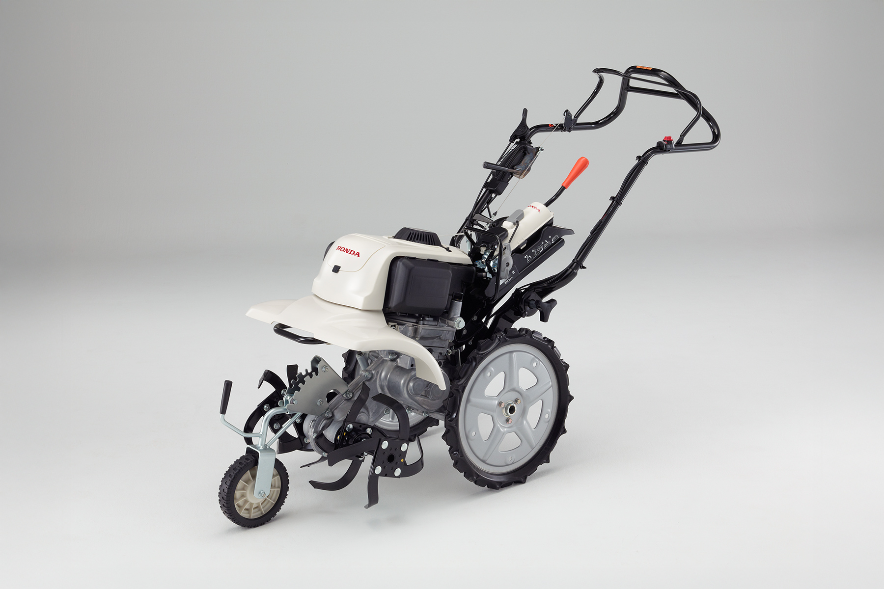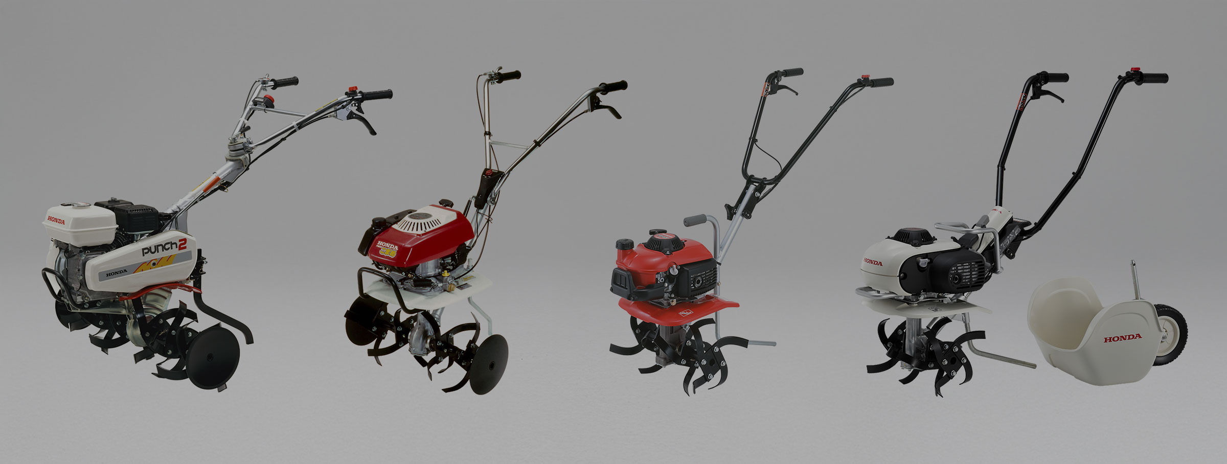 現在のHonda耕うん機は、車軸ローター式の小型耕うん機が、こまめをはじめとした4モデル(ピアンタ・プチな・こまめ・パンチ)、フロントロータリー式の中型耕うん機がサ・ラ・ダ、そしてリアロータリー式の大型耕うん機が3モデル(ラッキーボーイ・ラッキーマルチ・ラッキー)と、様々な農作業で使用することを想定して耕うん機を用意しています。