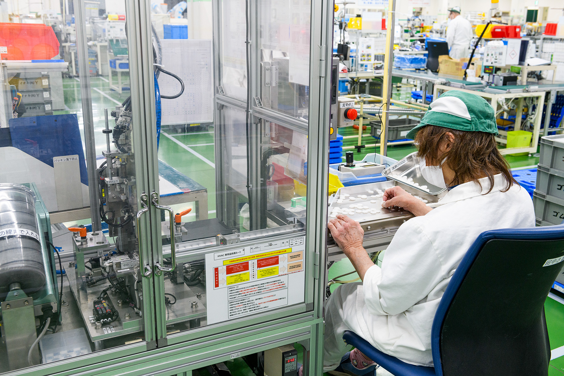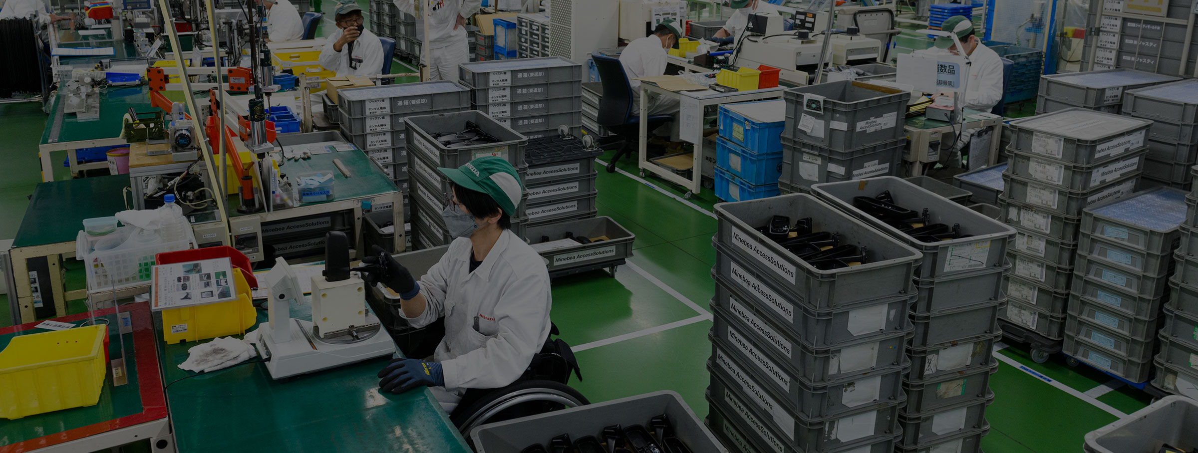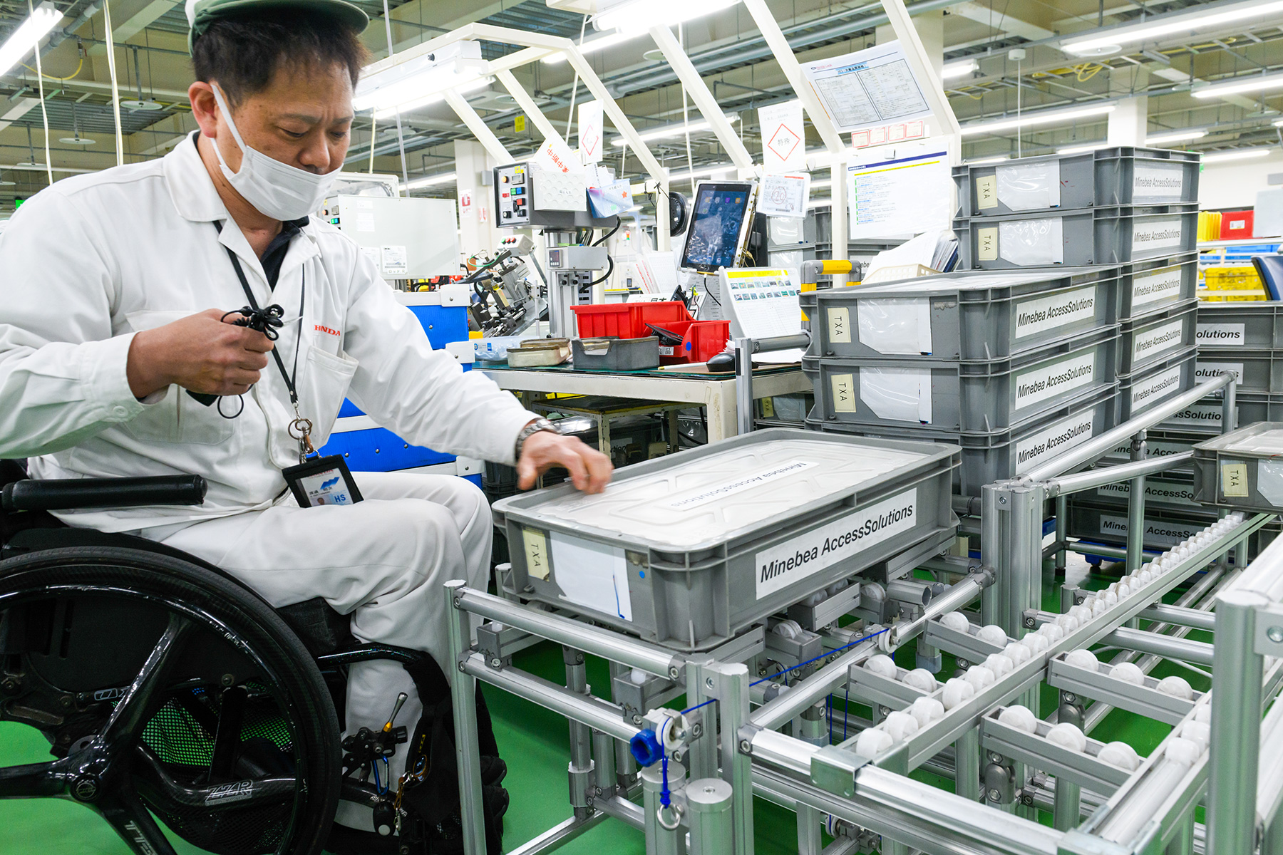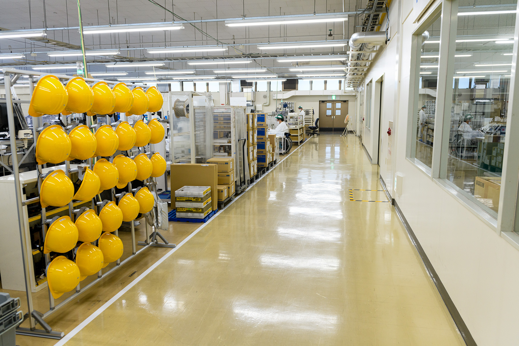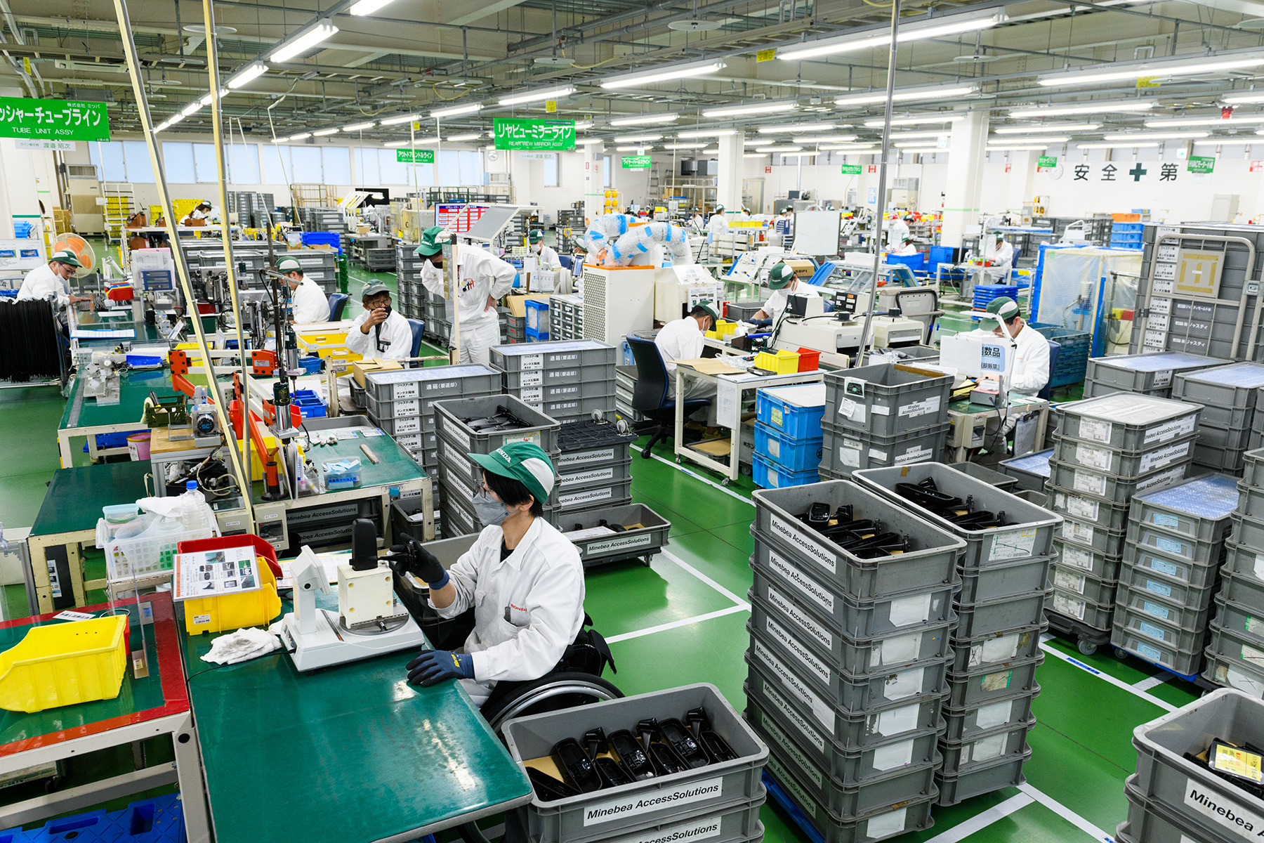 工場内は、車いす同士が容易にすれ違える通路幅を確保している。