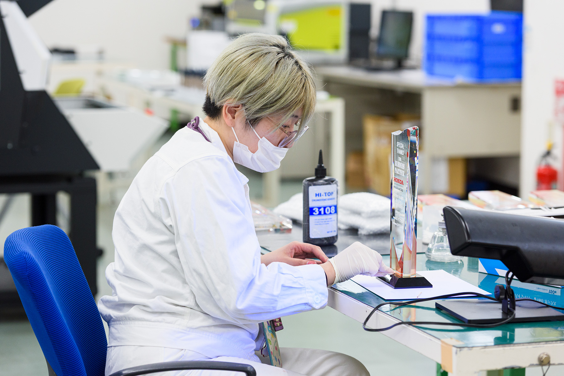 施設は第1工場、第2工場に加えて、データビジネス棟、厚生棟から成り立っています。第1工場、第2工場では、Hondaの四輪や二輪・パワープロダクツの部品を生産するラインが主で、Hondaの名刺や記念品の制作から、紙データをデータ化する電子化業務、3D造形業務、購買代行業務などを行っています。また、ホンダ太陽の独自事業としてアパレルやグッズの企画制作も行っています。