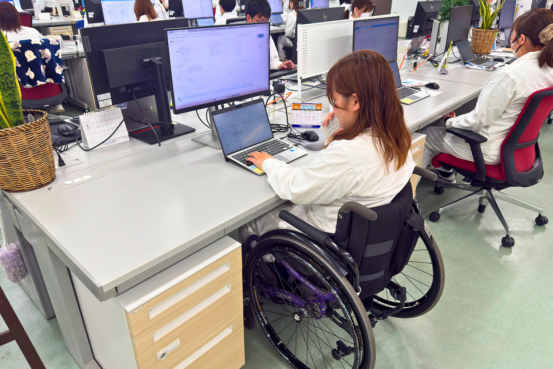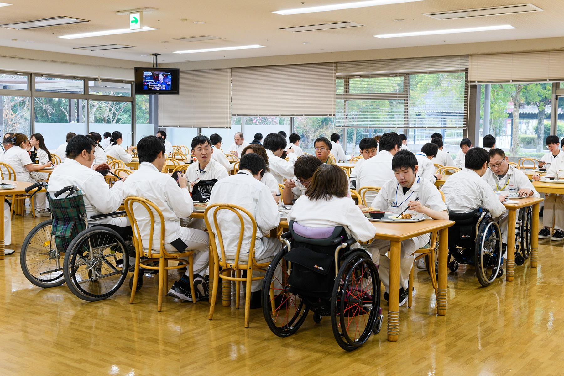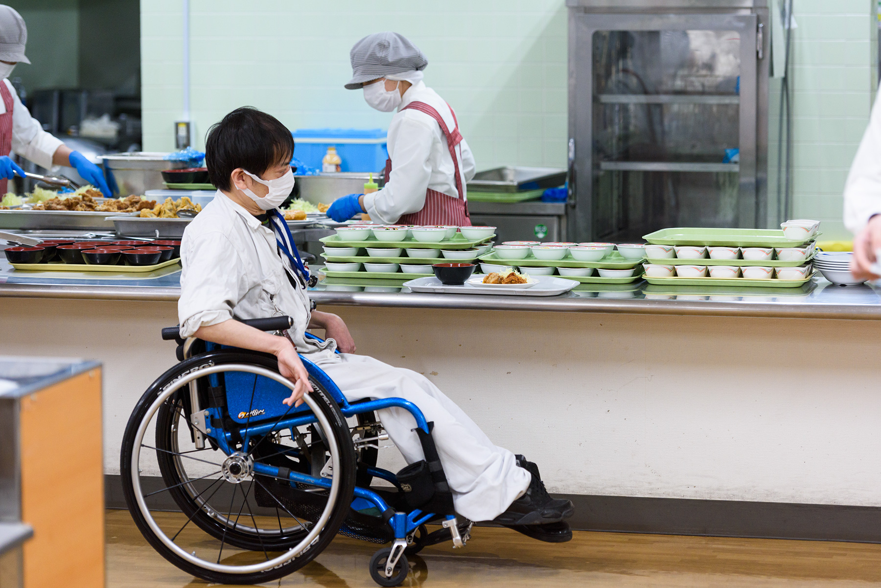 工場で作業する障がいのある人は、主に身体障がい、知的障がい、精神障がいに分かれ、それぞれの障がいの度合いや内容に沿って作業を担当しています。工場やデータビジネス棟では、車いすでの作業がしやすいように着席する机の高さを70cmとし、食堂のテーブルやトイレの洗面台などもこの高さに統一。工場内の通路は、車いす同士が容易にすれ違える幅を確保していたり、車いす利用者の視界を遮る高さにパソコンのモニターを置かない、有事の際に聴覚障がいのある人に情報を伝えるパトランプを設置する、社員食堂の配膳台も車いすからトレイを取りやすいように低めに設定する、といった工夫をしているのです。