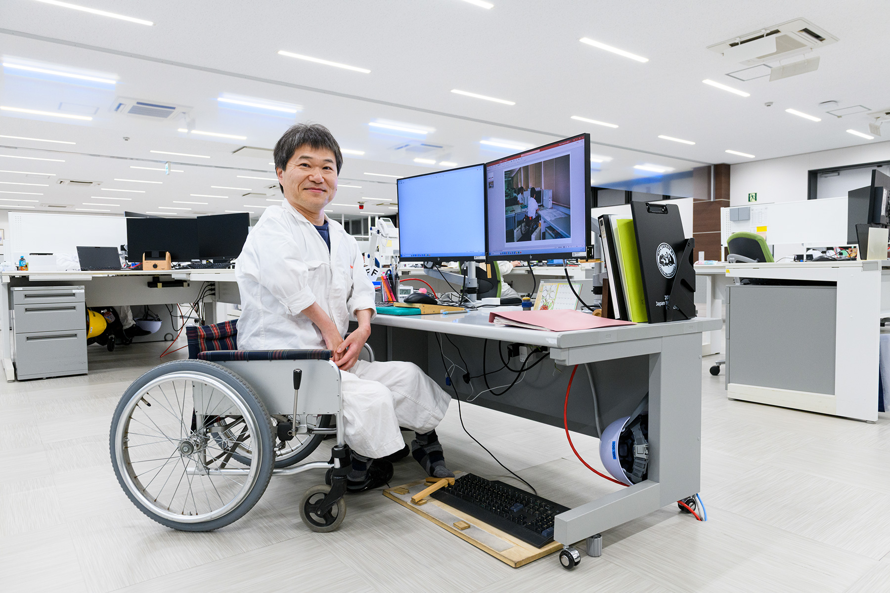 障がいに合わせたデスクを使用する従業員も。足で操作するキーボードは、自ら工夫して作成したもの。