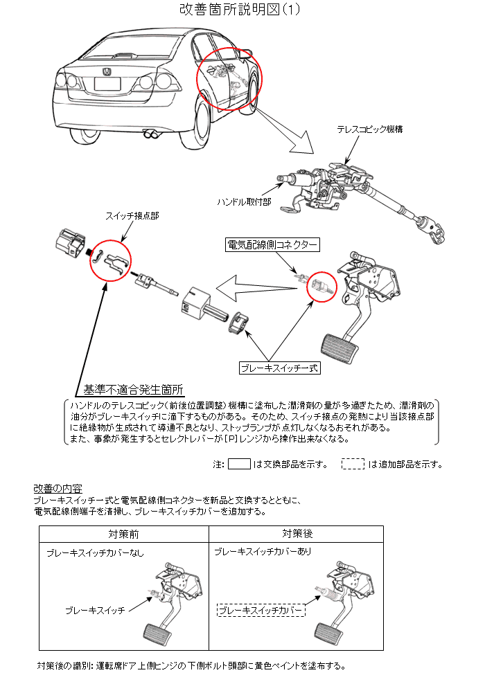 (1)ハンドルのテレスコピック(前後位置調整)機構に塗布した潤滑剤の量が多過ぎたため、潤滑剤の油分がブレーキスイッチに滴下するものがある。 そのため、スイッチ接点の発熱により当該接点部に絶縁物が生成されて導通不良となり、ストップランプが点灯しなくなるおそれがある。