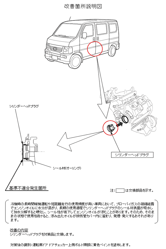 冷機時の長時間暖機運転や短距離走行の使用頻度が高い車両において、ブローバイガスの凝縮結露でエンジンオイルに水分が混ざり、長期の使用過程でシリンダーヘッドプラグのシール材表面が吸水して加水分解すると硬化し、シール性が低下してエンジンオイルが滲むことがあります。そのため、そのままの状態で使用を続けると、滲み出たオイルが排気管カバー内に溜まり、発煙・発火するおそれがあります。