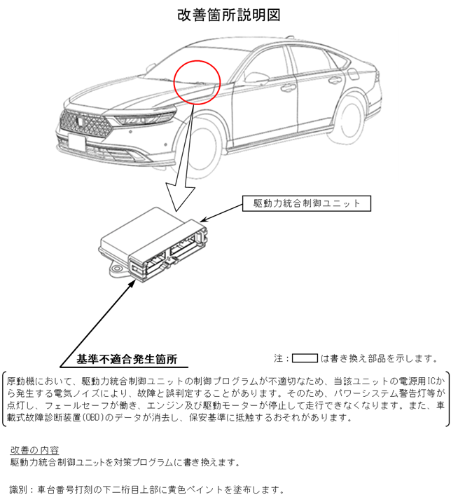 原動機において、駆動力統合制御ユニットの制御プログラムが不適切なため、当該ユニットの電源用ICから発生する電気ノイズにより、故障と誤判定することがあります。そのため、パワーシステム警告灯等が点灯し、フェールセーフが働き、エンジン及び駆動モーターが停止して走行できなくなります。また、車載式故障診断装置(OBD)のデータが消去し、保安基準に抵触するおそれがあります。