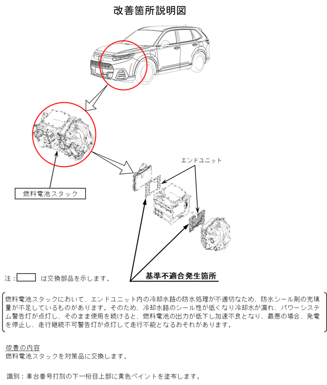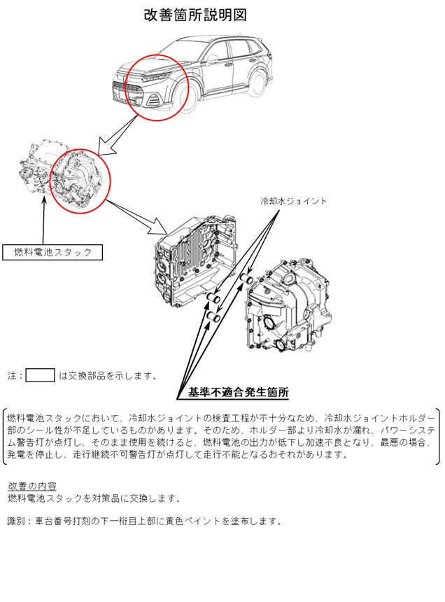 燃料電池スタックにおいて、エンドユニット内の冷却水路の防水処理が不適切なため、防水シール剤の充填量が不足しているものがあります。そのため、冷却水路のシール性が低くなり冷却水が漏れ、パワーシステム警告灯が点灯し、そのまま使用を続けると、燃料電池の出力が低下し加速不良となり、最悪の場合、発電を停止し、走行継続不可警告灯が点灯して走行不能となるおそれがあります。