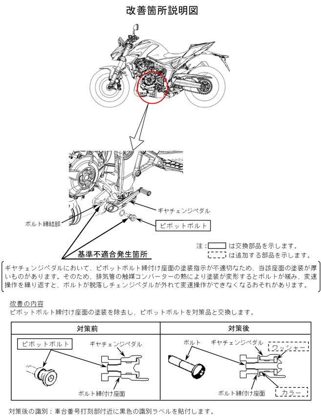 ギヤチェンジペダルにおいて、ピボットボルト締付け座面の塗装指示が不適切なため、当該座面の塗装が厚いものがあります。そのため、排気管の触媒コンバーターの熱により塗装が変形するとボルトが緩み、変速操作を繰り返すと、ボルトが脱落しチェンジペダルが外れて変速操作ができなくなるおそれがあります。