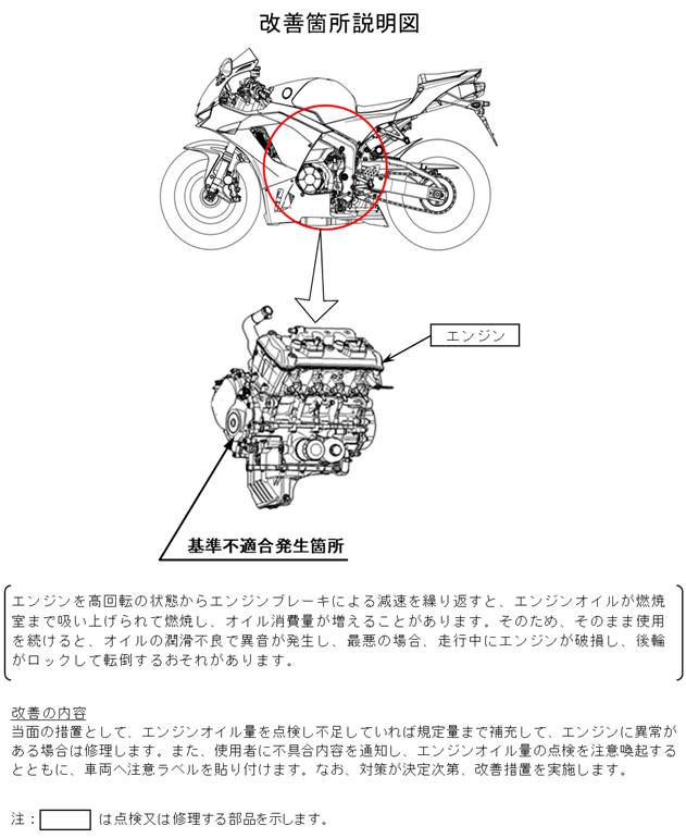 当面の措置として、エンジンオイル量を点検し不足していれば規定量まで補充して、エンジンに異常がある場合は修理します。また、使用者に不具合内容を通知し、エンジンオイル量の点検を注意喚起するとともに、車両へ注意ラベルを貼り付けます。なお、対策が決定次第、改善措置を実施します。