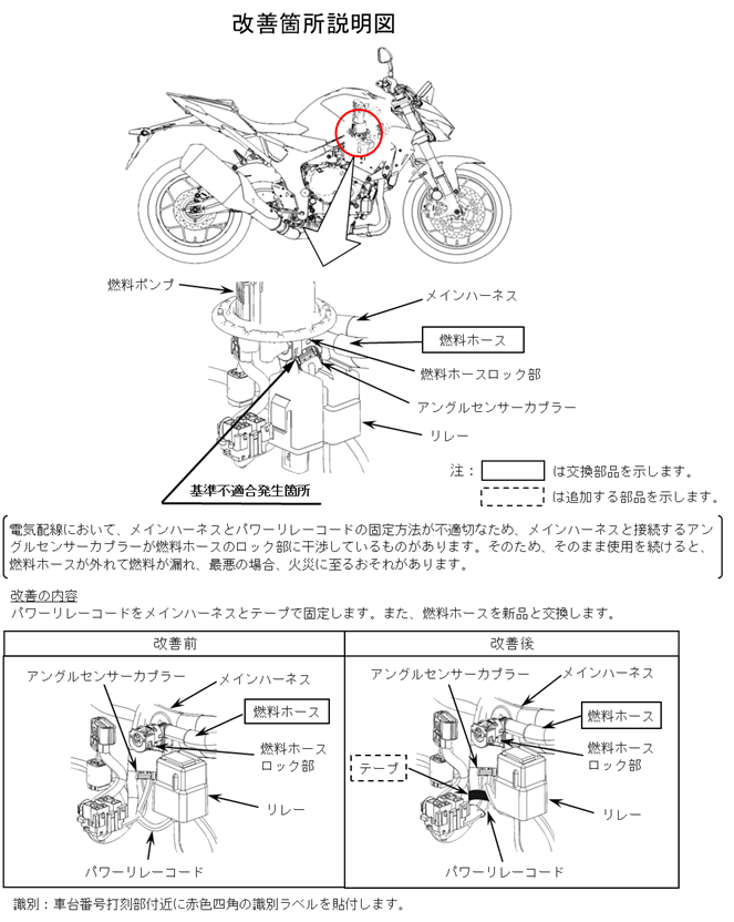 電気配線において、メインハーネスとパワーリレーコードの固定方法が不適切なため、メインハーネスと接続するアングルセンサーカプラーが燃料ホースのロック部に干渉しているものがあります。そのため、そのまま使用を続けると、燃料ホースが外れて燃料が漏れ、最悪の場合、火災に至るおそれがあります。
