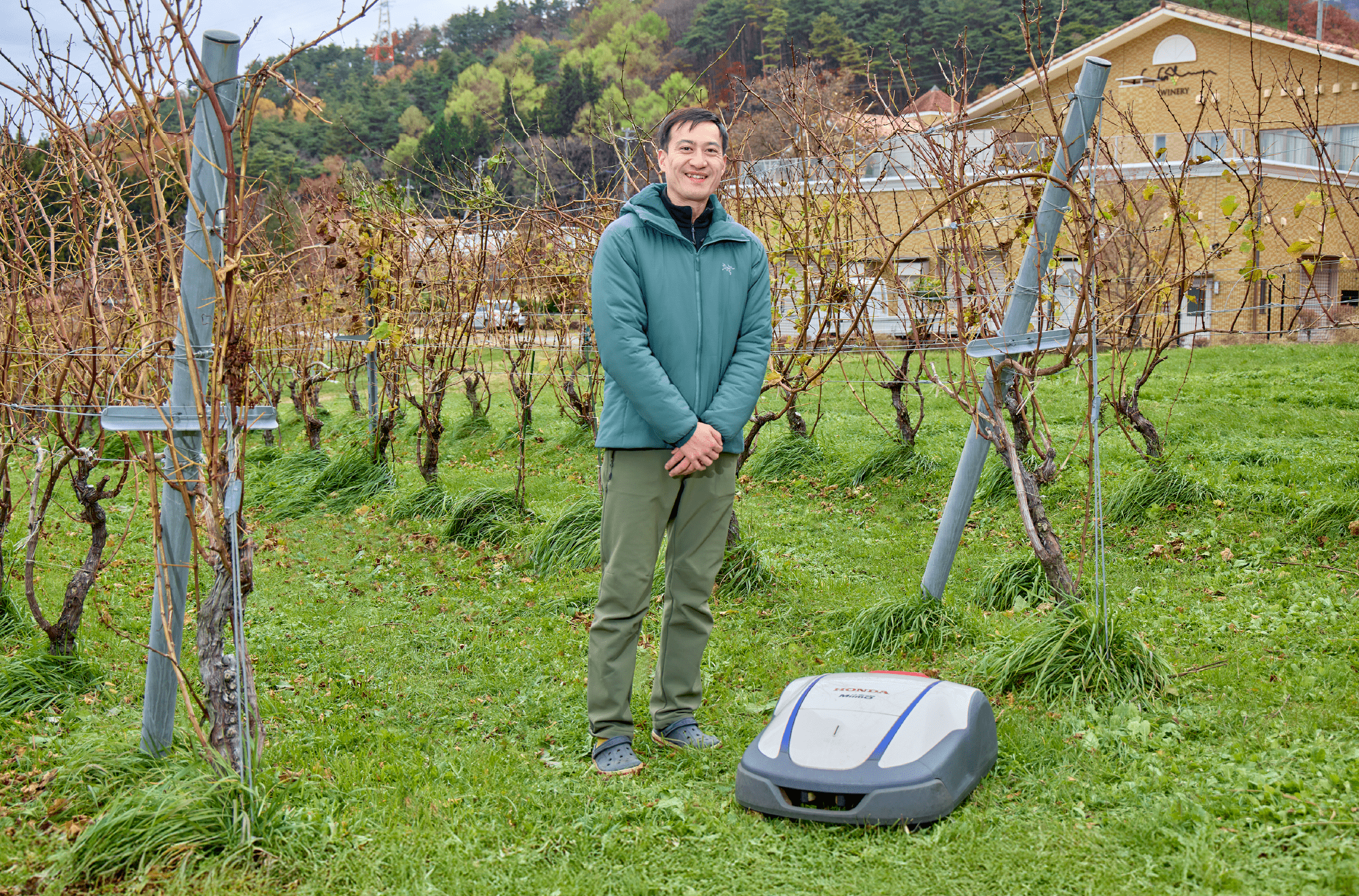 Hondaのグラスミーモは登坂性能が高いと知り、ぜひ使ってみたいと思いました。Hondaの認定販売店のマルモ機械さんに問い合わせて、エリアワイヤーを設置してもらい、1週間以上試せるデモサービスを利用させてもらったところ、畝間も、樹と樹の間も、タイヤが地面をしっかりグリップして力強く進みながら刈っていく。これなら任せられそうだと思い、経営陣に導入を提案しました。価格、性能、導入後に期待できるメリットなど、国内で販売されている他のメーカーや機種もかなり詳細に調べて、比較資料をつくりましたね。グラスミーモで特に強調したのは、斜面でのパフォーマンスが安定していること、24時間いつでも自動で稼働すること、そしてなによりも、除草作業の効率化でスタッフの負担が減らせること。より良いワイン造りにつながる投資であると理解してもらうことができ、2024年8月から導入することが決まりました。