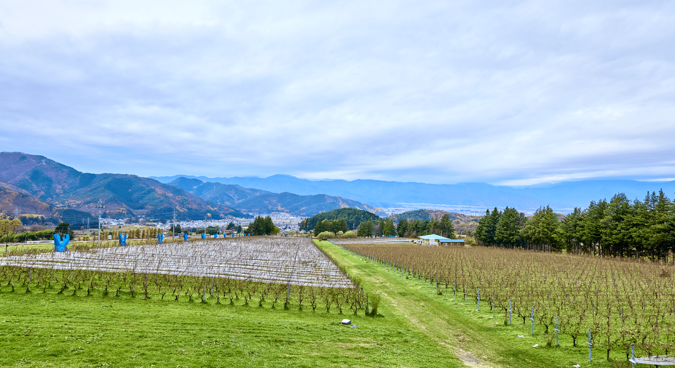 陽当たり、風通し、昼夜の寒暖差など、醸造用ぶどう栽培に適した条件がそろった豊かな圃場。