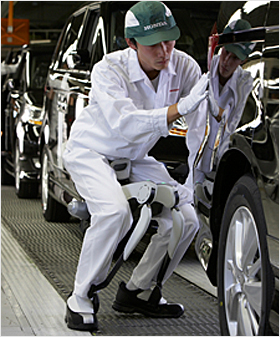 機器の有効性の検証を開始しました。この映像はHonda埼玉製作所で撮影した検証イメージです。立ち姿勢での部品の運搬などの繰り返し作業や、検査などの中腰姿勢を含む立ち作業における疲労軽減効果の確認や使い勝手を検証し、そこで抽出された課題をもとに機器を改良していきます。