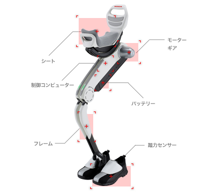 使用者※の体重の一部を機器が支えることで、脚の筋肉と関節(股関 節、ひざ関節、足首関節)の負担を軽減する。機器は主に、シートとフレーム、靴で構成されるシンプルな構造となっており、靴を履き、シートを持ち上げるだけで、手軽に装着することができる。また、Honda独自の、人の重心方向へアシスト力を向かわせる機構と、脚の動きに合わせたアシスト力の制御により、様々な動作・姿勢での自然なアシストを可能とした。