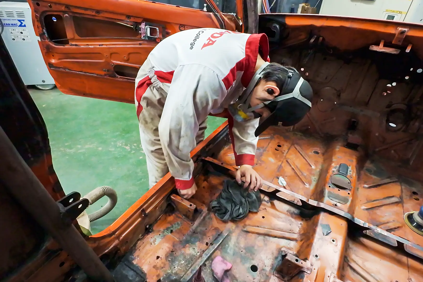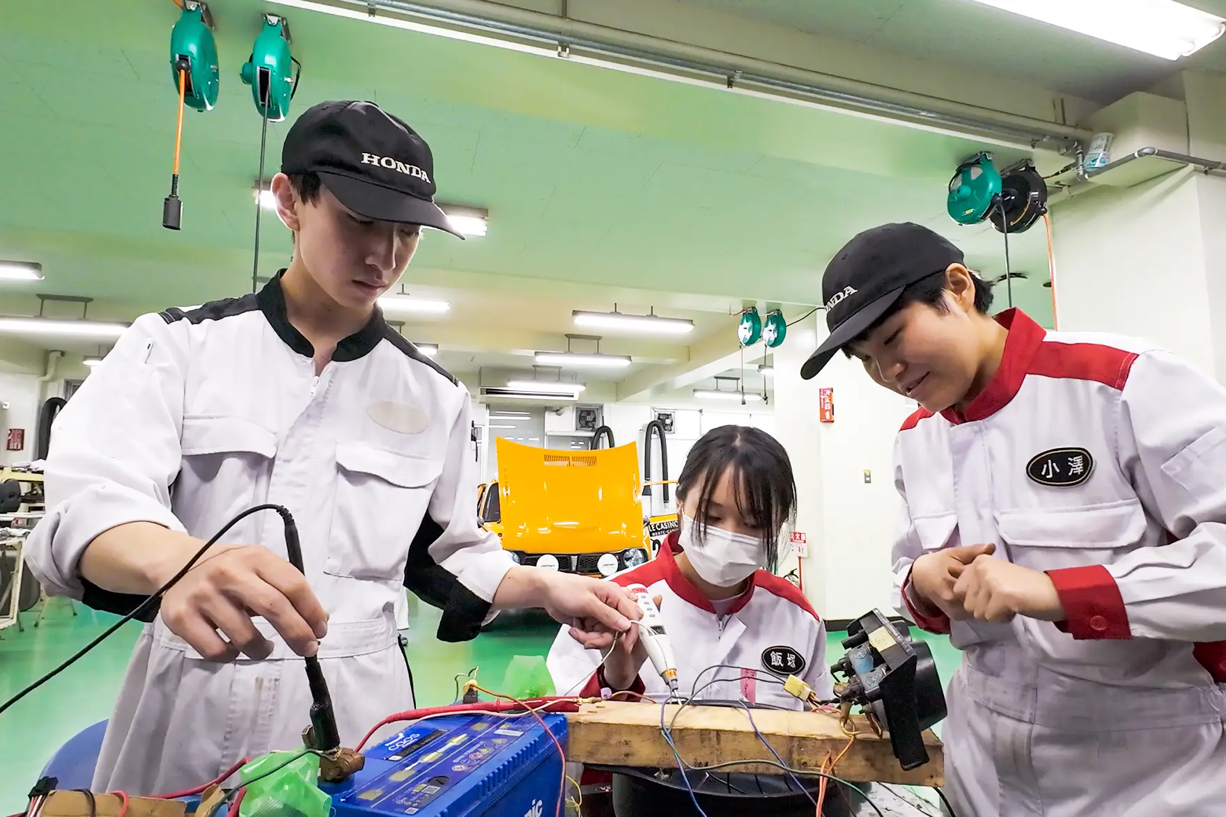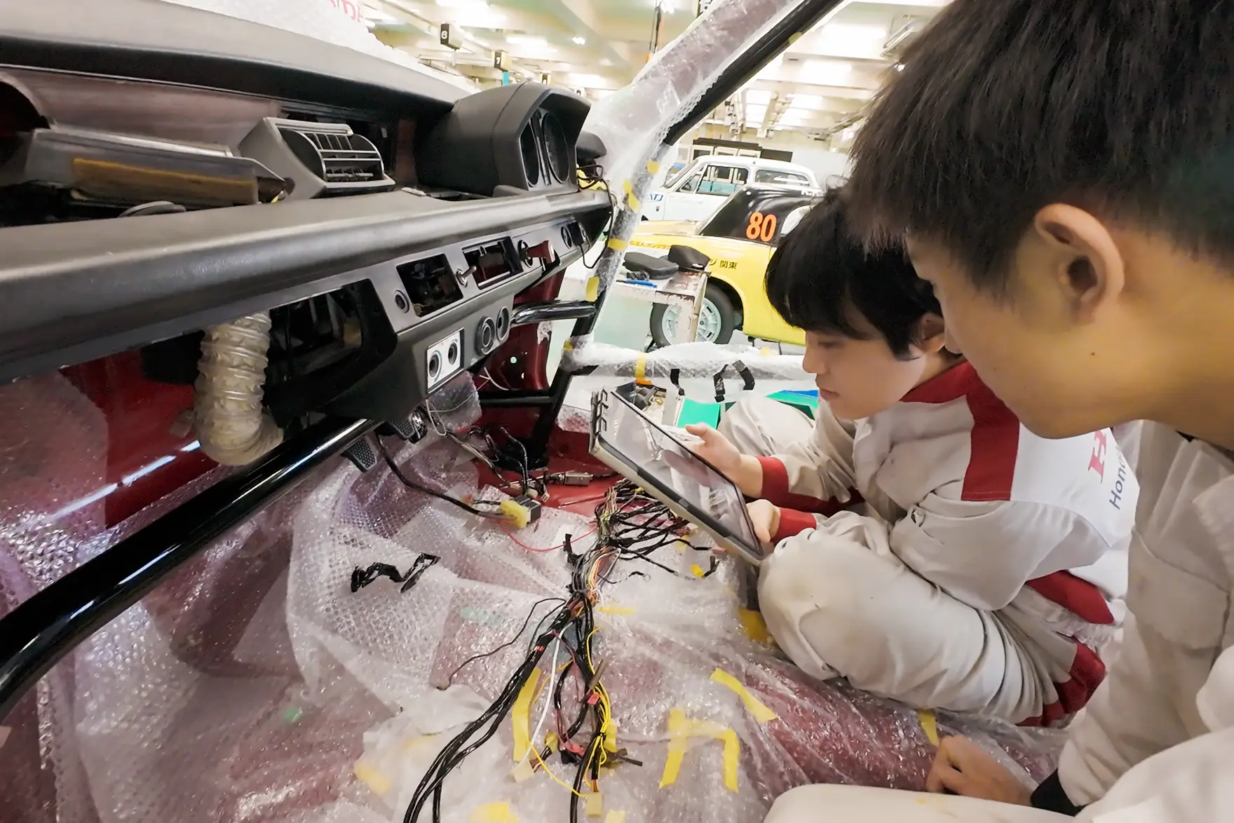 そこで、エンジン、サスペンション、ワイヤーハーネスやメーター類などの電装部品、ガラスも含めてすべて取り外し、各部品を分解・整備するフルレストアを行いました。レストアはすべて学生の手で行われ、授業を終えた午後4時40分ごろから作業を開始。夜に及ぶことや休日も利用して作業を行いました。初代CIVIC RSはおよそ50年前のクルマ。燃料供給装置のキャブレター、サスペンションやブレーキ、電装品類など、現在のクルマにはそもそも存在しないパーツや存在しても異なる構造など、学生にとってレストア作業は未知との遭遇の連続でした。どのように分解し、不具合を見つけて直すのか。教員のアドバイスを受け、模索しながらの作業です。