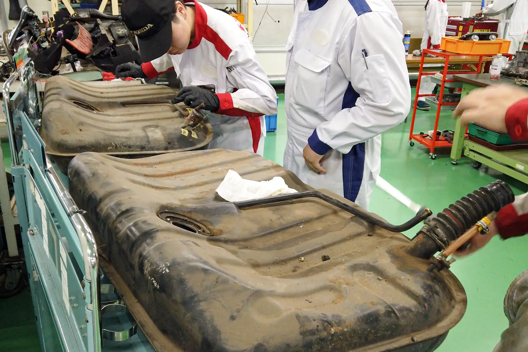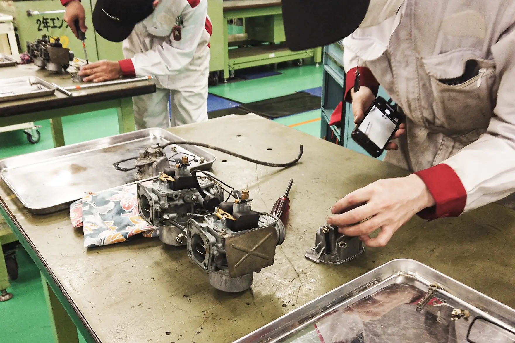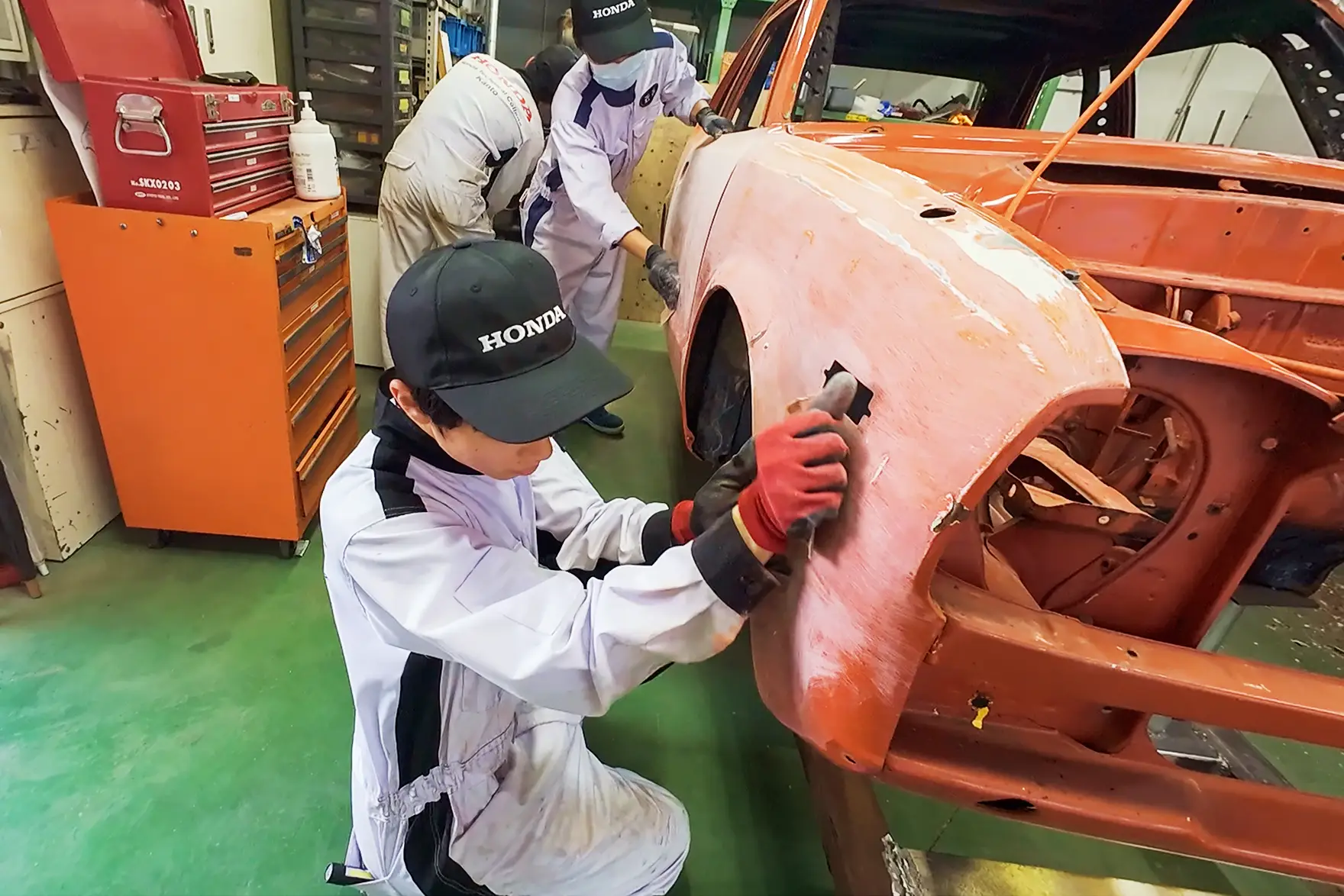 そこで、エンジン、サスペンション、ワイヤーハーネスやメーター類などの電装部品、ガラスも含めてすべて取り外し、各部品を分解・整備するフルレストアを行いました。レストアはすべて学生の手で行われ、授業を終えた午後4時40分ごろから作業を開始。夜に及ぶことや休日も利用して作業を行いました。初代CIVIC RSはおよそ50年前のクルマ。燃料供給装置のキャブレター、サスペンションやブレーキ、電装品類など、現在のクルマにはそもそも存在しないパーツや存在しても異なる構造など、学生にとってレストア作業は未知との遭遇の連続でした。どのように分解し、不具合を見つけて直すのか。教員のアドバイスを受け、模索しながらの作業です。
