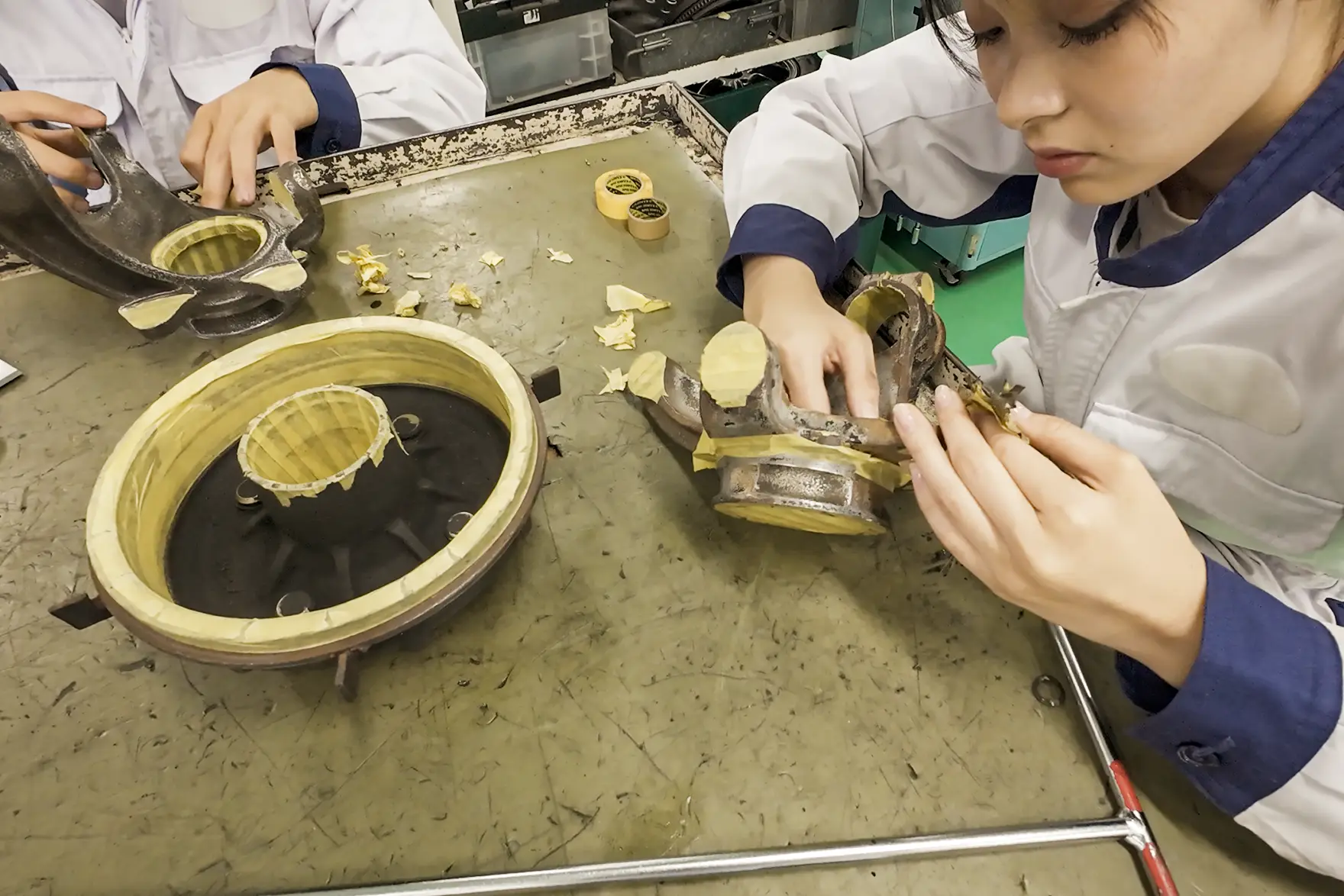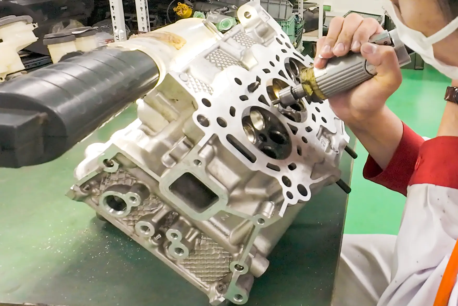 混合気や燃焼ガスの流れを良くするために、手作業で吸排気ポートを研磨。