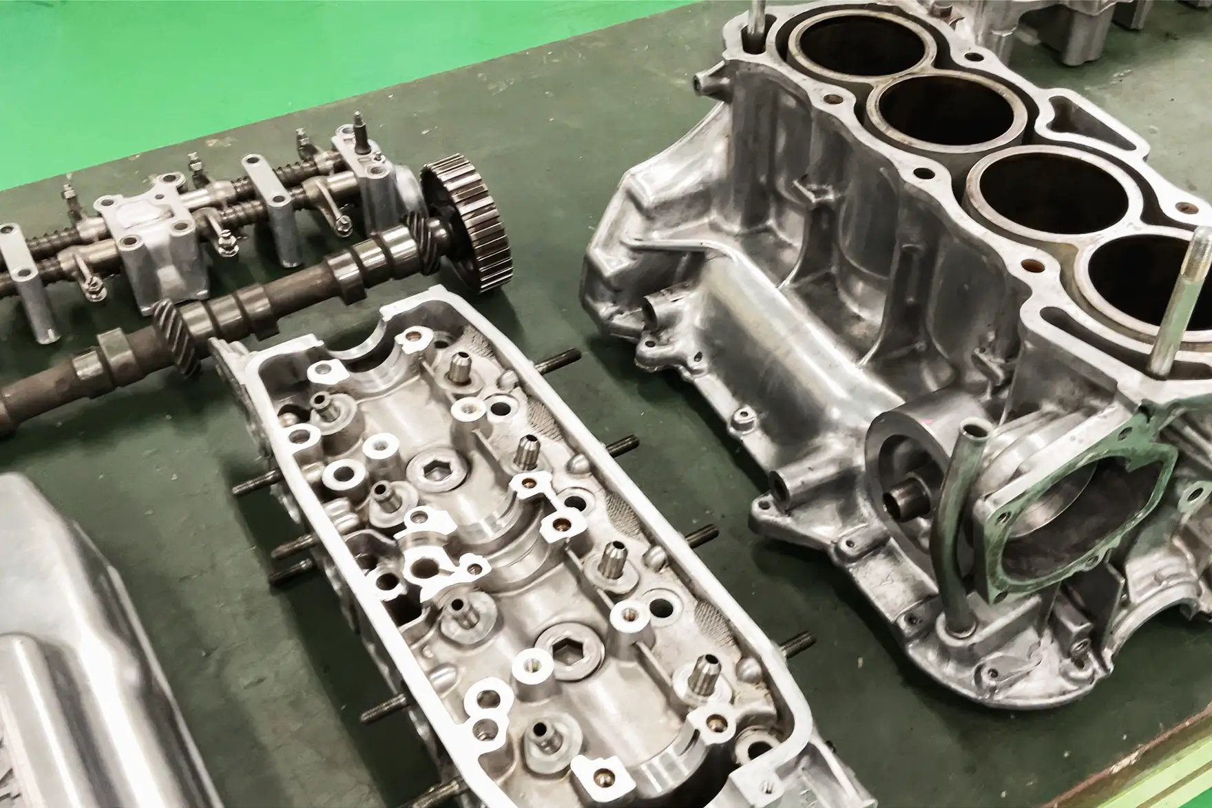 分解したエンジン。ブロックなどが綺麗に磨き上げられている。