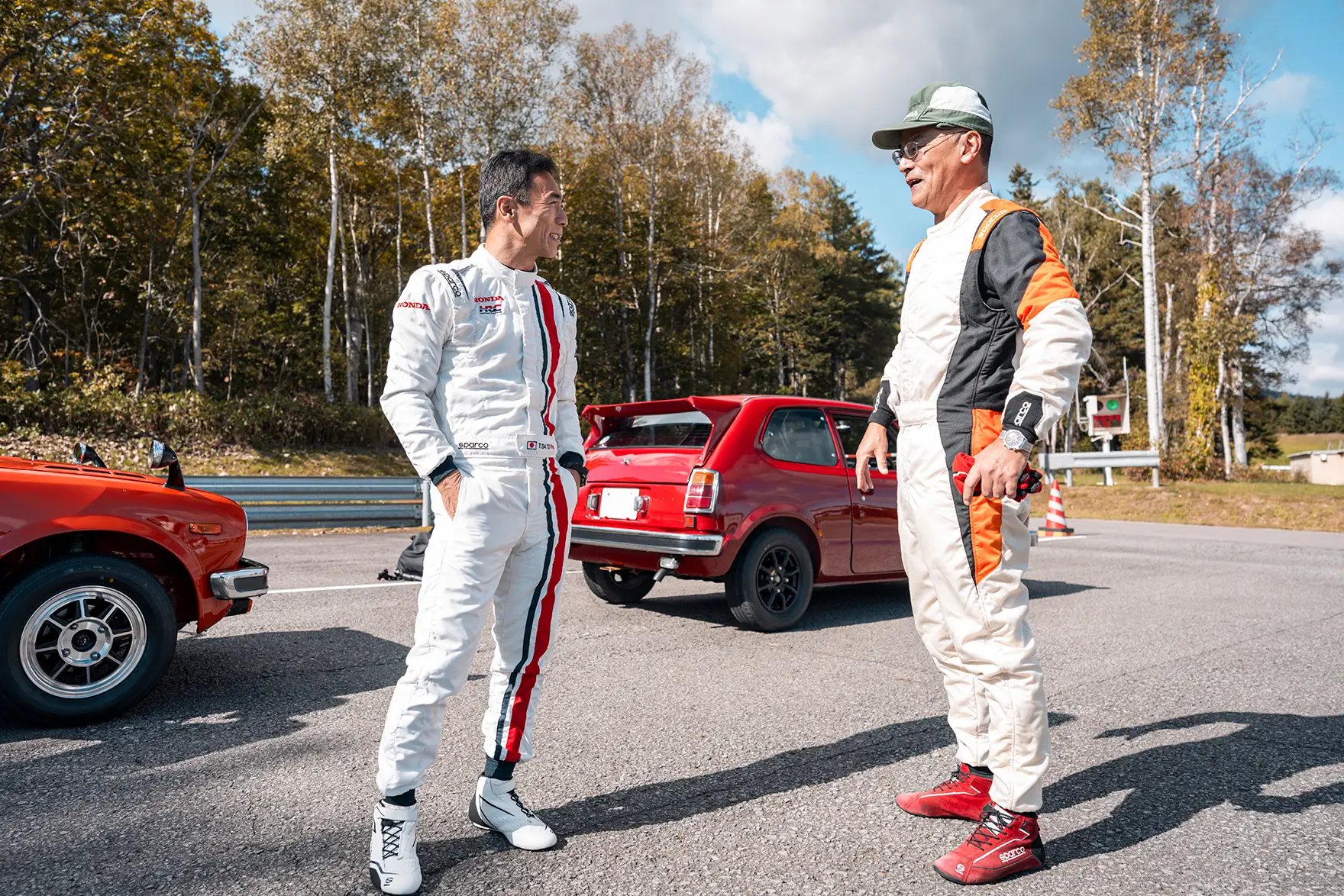 なんとかレストアを終えて車検を取った2台を待っていたのは、「北海道ラリーキャラバン」という学園内のイベント。埼玉県のホンダ学園を出発し北海道まで走り(八戸〜苫小牧はフェリー)、再び学園に戻るコースを走行します。ラリー本番を模擬するため、カーナビゲーションやスマートフォンを使用せず、コース上の交差点や目印を記載したコマ図に従って、指定された平均速度を維持した上で時間内に走り切るレギュラリティラリー形式で走行しました。コマ図は、教員が実際の行程を自身のバイクで走行して作成したオリジナルのもの。この取り組みだけでも並々ならぬ情熱を感じます。北海道ではHonda鷹栖プルービンググラウンドに向かい実走テストを行いました。ステアリングを握ったのは、実際にラリーに参戦するドライバー。マドリード号は、ホンダ学園関東校の校長である勝田啓輔さん、サンセット号は、このチャレンジプロジェクトに賛同したレーシングドライバーの佐藤琢󠄀磨さんです。