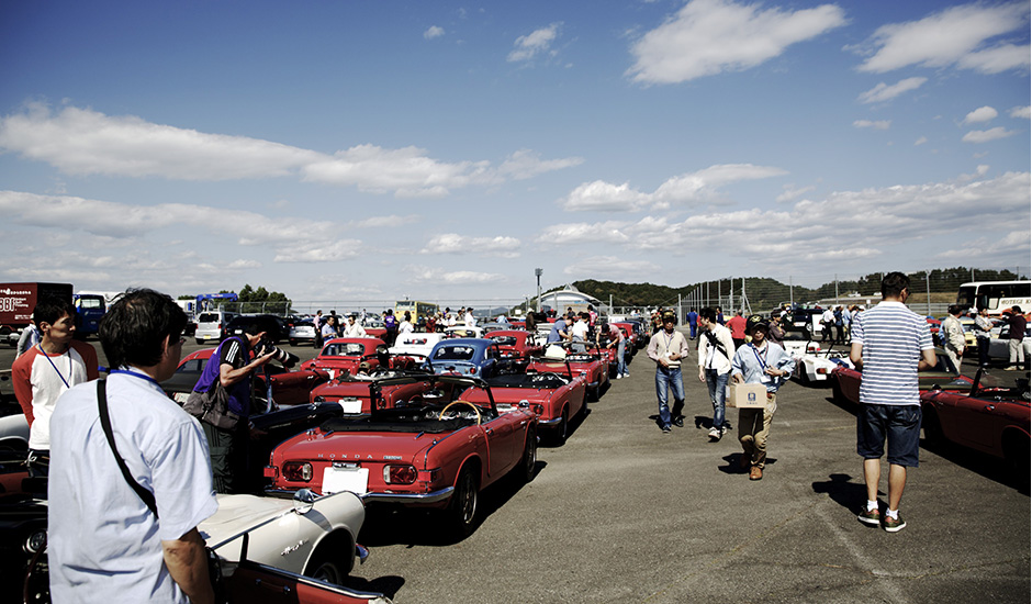 スピードトライアルに先立ちデモラン。主催のツインカムクラブ会長 那須さんのS800(中央)には